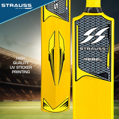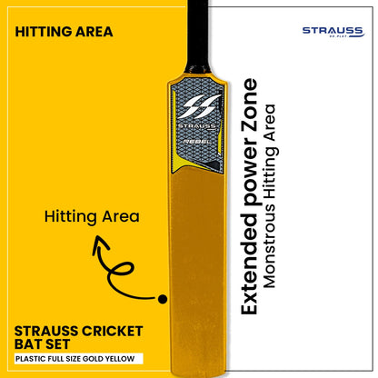 Combo: Strauss Cricket Kit Set - Full Size | 1 Bat + 1 Ball + 3 Stumps + 2 Bails + 1 Base | Golden Yellow | For All Age Groups