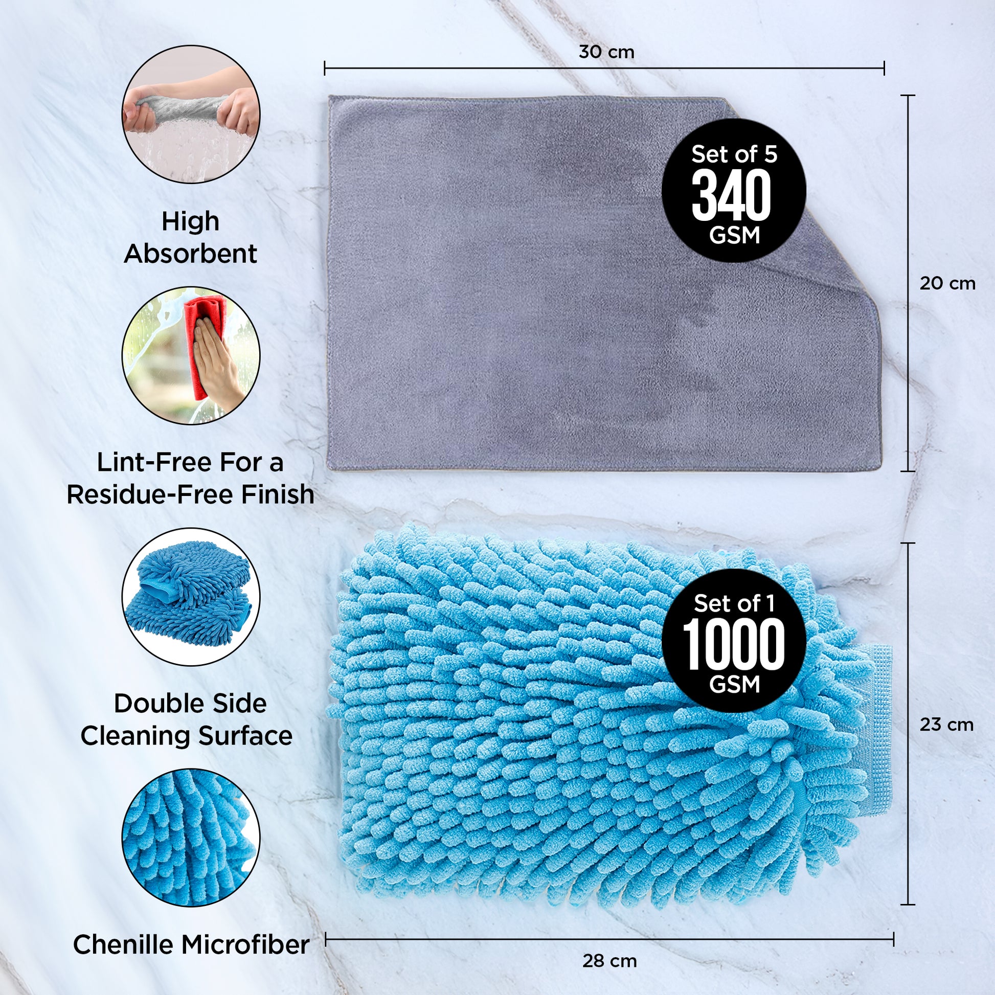 Combo: Microfiber Cleaning Cloths & Chenille Wash Mitt | Household Duster | 20x30cm | Blue