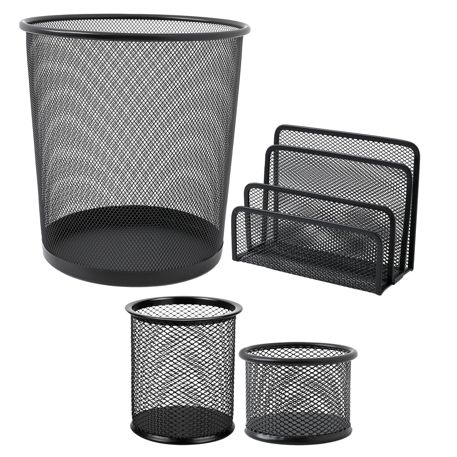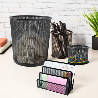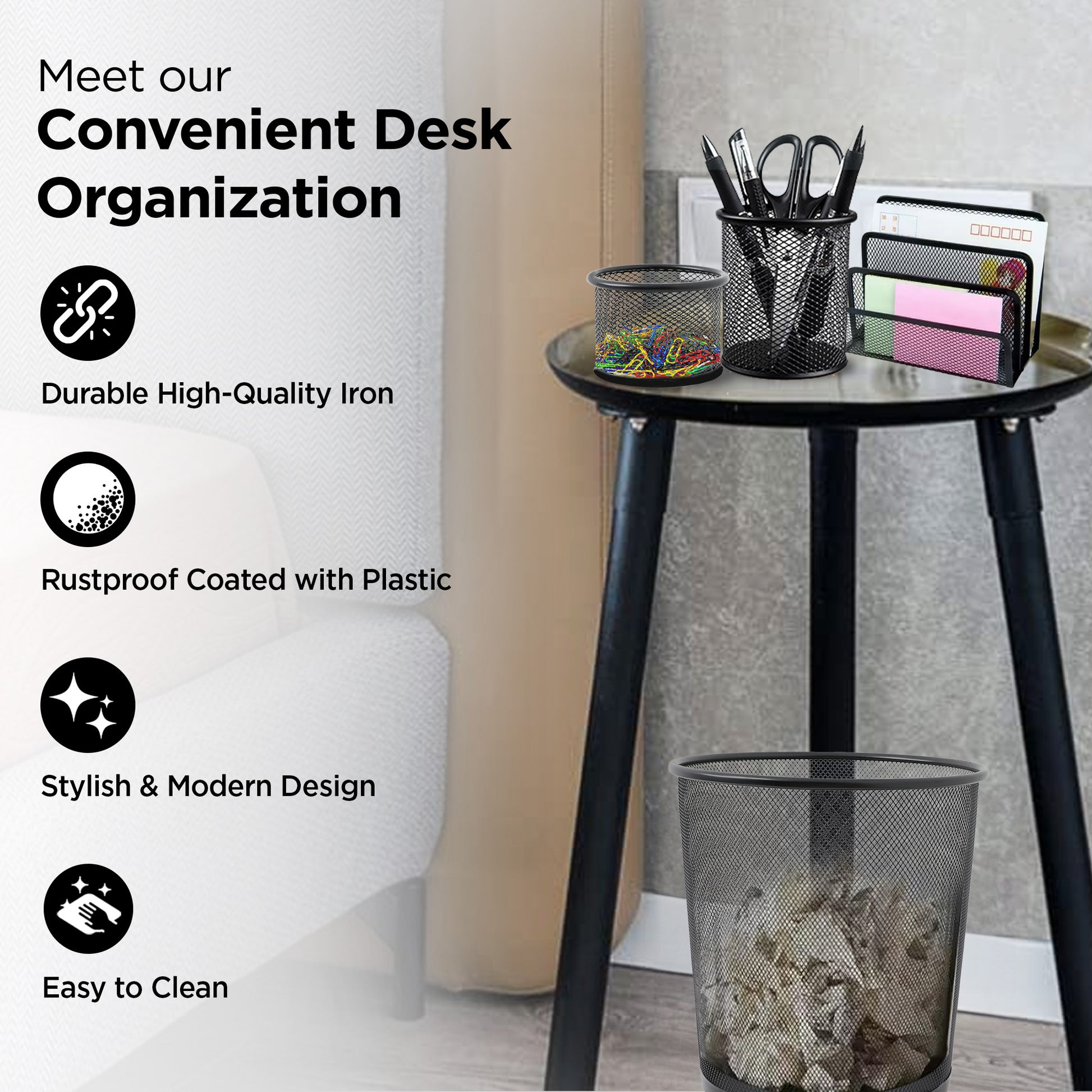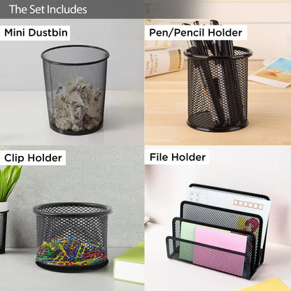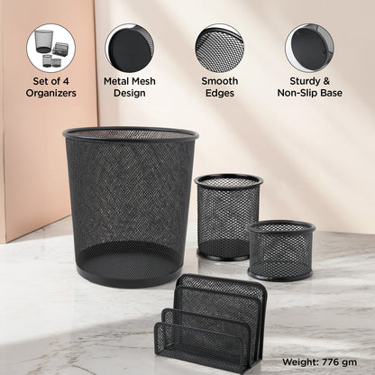 Office Desk Accessories Set of 4- Dustbin, Pen Holder For Office, Paper Clips/Pins Holder & Books Diaries Files Holder | Metal Mesh Design Space Saving Organizer For Office Reception Table