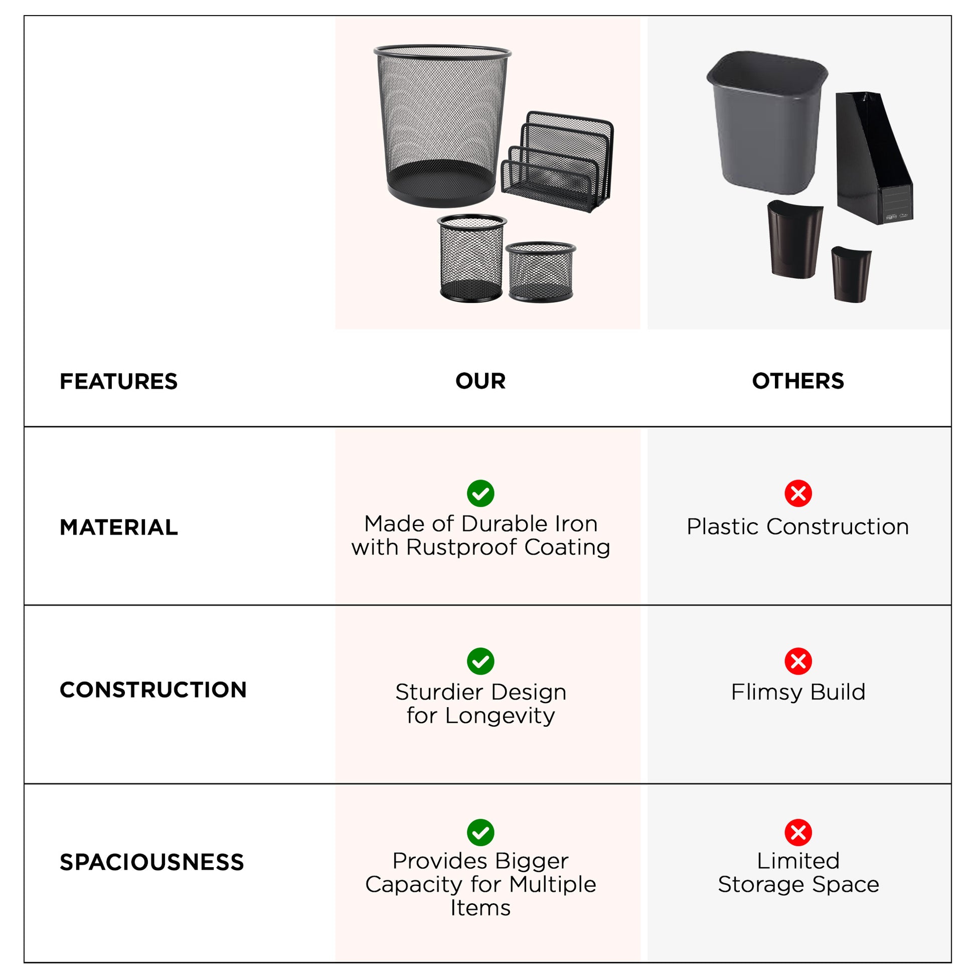 UMAI Office Desk Accessories Set of 4- Dustbin, Pen Holder For Office, Paper Clips/Pins Holder & Books Diaries Files Holder | Metal Mesh Design Space Saving Organizer For Office Reception Table