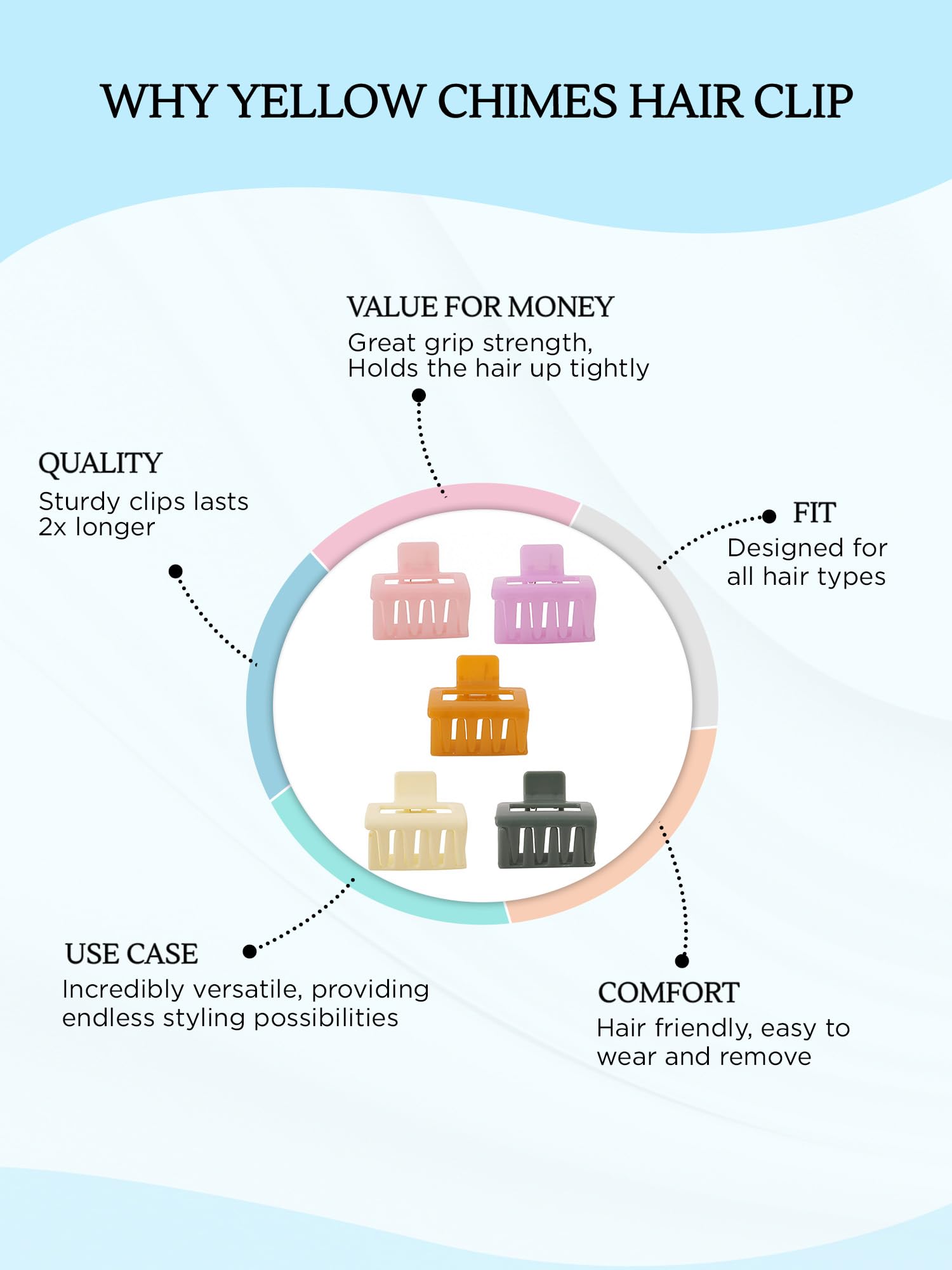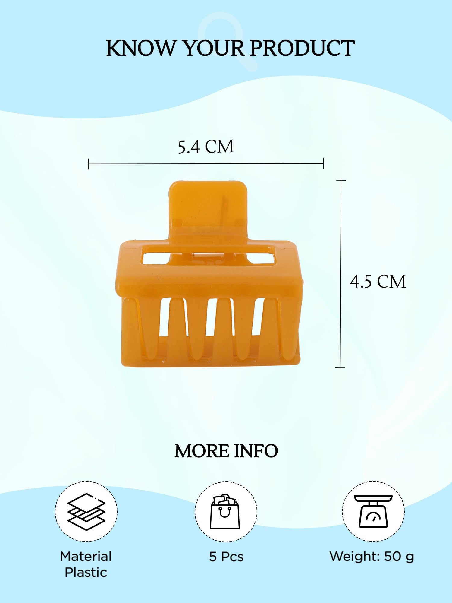 Introducing the Yellow Chimes Claw Clips for Women, a stylish and practical solution for all your hair accessory needs. This set includes 5 durable claw clips, each measuring 4.5 cm in length and 5.4 cm in width. Crafted from high-quality plastic, these clips are perfect for every occasion, whether you're dressing up for a party or enjoying a casual day out.