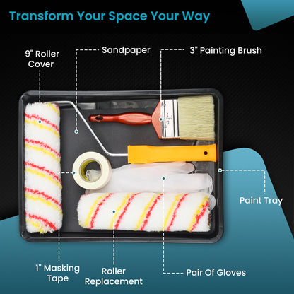 Introducing the Complete DIY Paint Kit by Cheston, an all-inclusive solution for your painting needs. This extensive kit includes a 9-inch Interior Roller, 3-inch Painting Brush, 1-inch Masking Tape, waterproof sandpaper, a painting tray, and comfortable gloves, ensuring you have everything necessary for a successful home painting project.