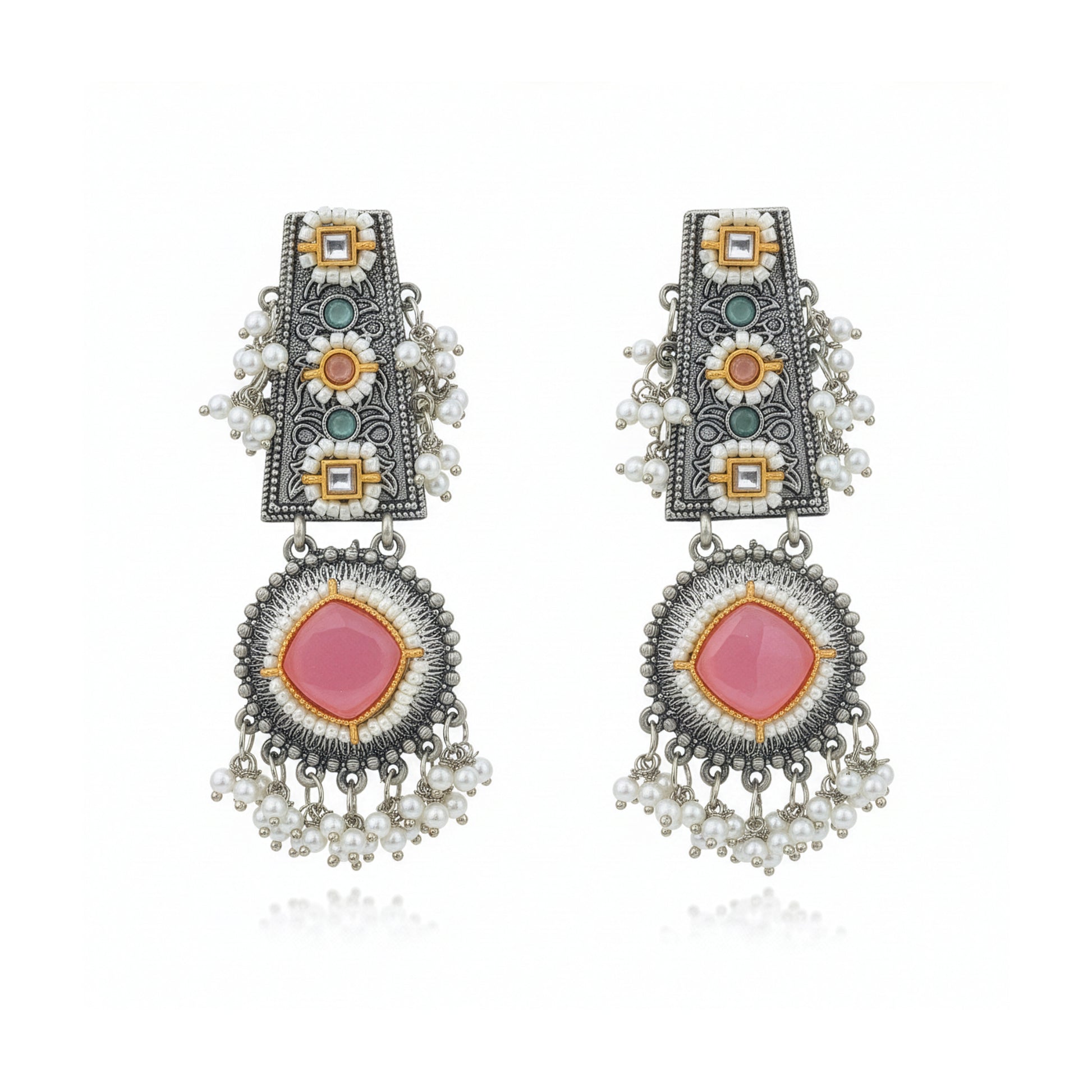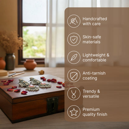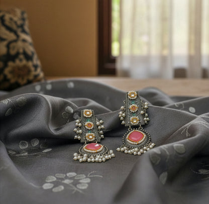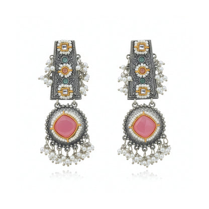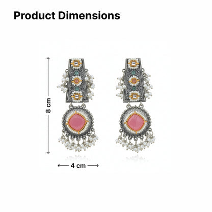 Introducing the Dangle Earrings by Yellow Chimes. Crafted from high-quality oxidised silver-plated alloy, these earrings feature intricate designs that combine elegance with versatility. Each pair includes one piece, styled in a beautiful silver finish, adorned with vibrant pink stone accents that beautifully complement traditional and modern outfits alike. Perfect for daily wear or special occasions, they arrive in an elegant box for safe and stylish presentation.