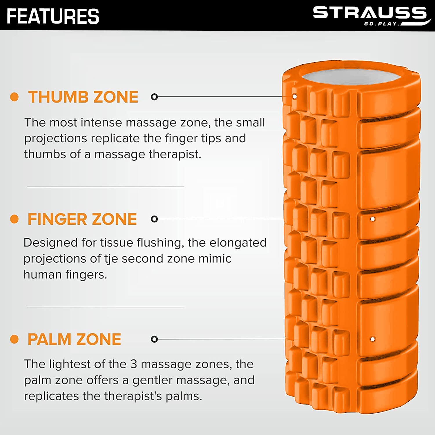 Introducing the Strauss Deep Tissue Massage Foam Roller, a 45 cm foam roller designed by Strauss Sports to enhance your recovery and flexibility. Made from durable Ethylene Vinyl Acetate, this foam roller features an ergonomic design that mimics the hands of a therapist, equipped with unique 3D massage zones: thumb, finger, and palm. It's perfect for releasing muscle stiffness and promoting blood flow, making it an essential tool in your fitness journey.