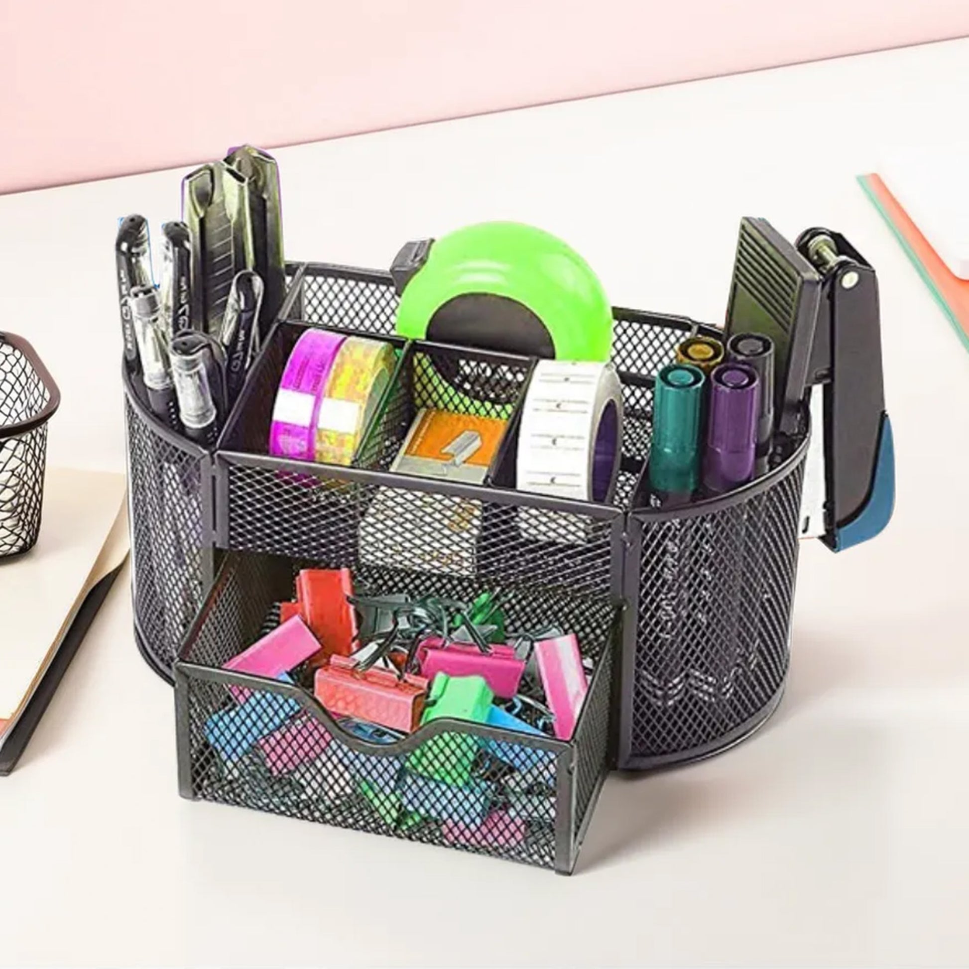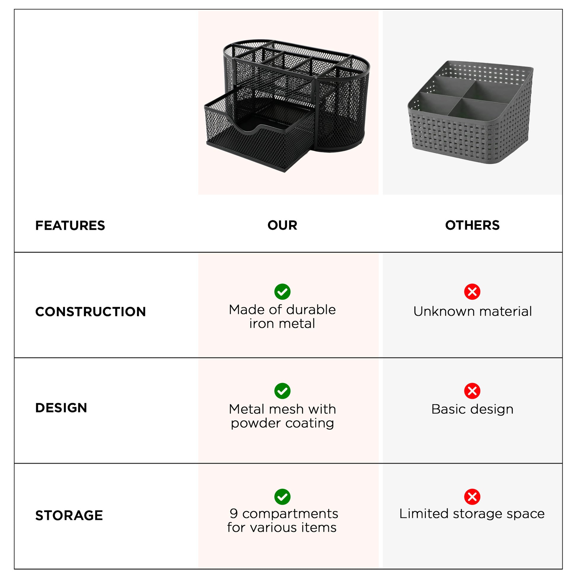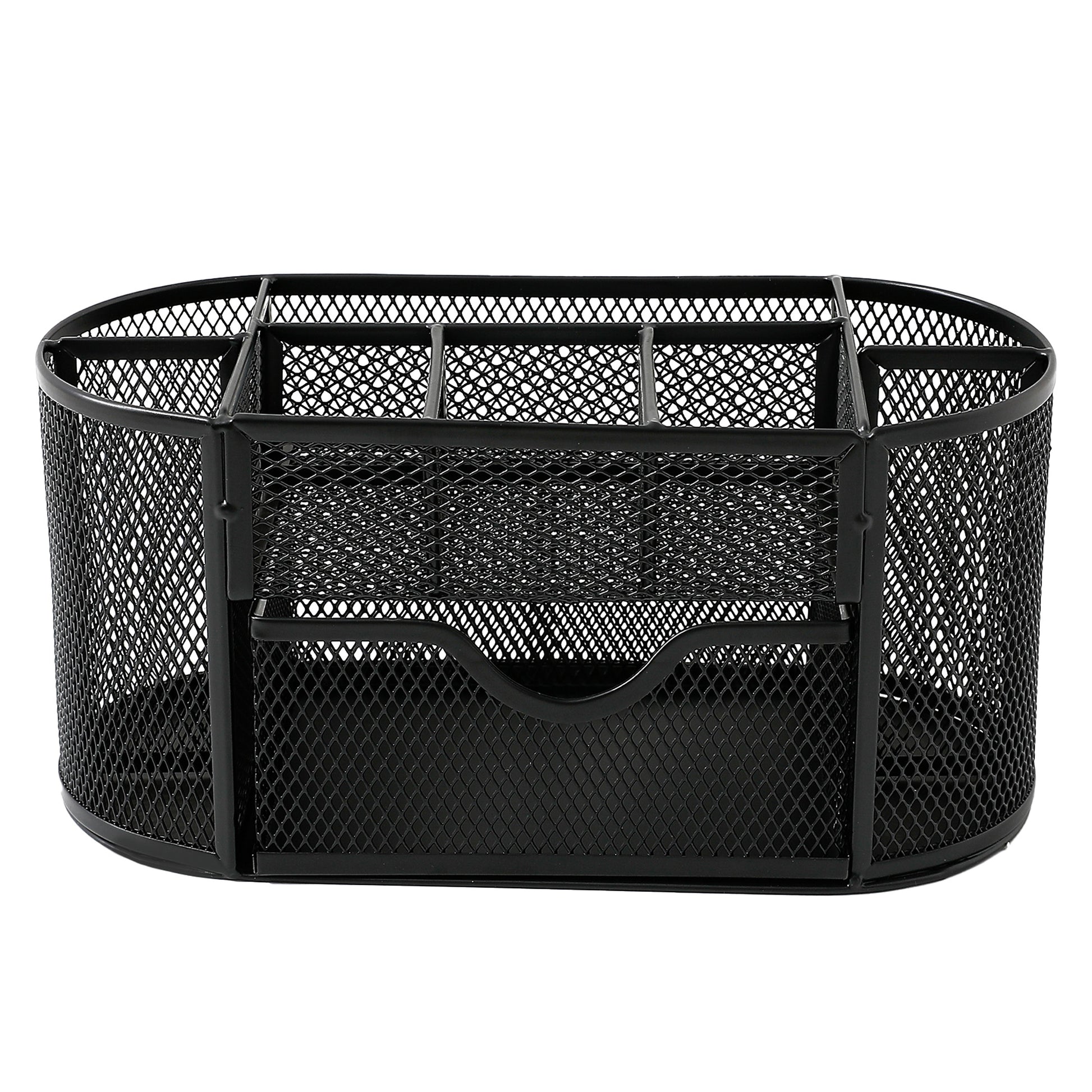 Desk Supplies Organiser with 9 Compartments | Stylish Metal Mesh Design | 22x11x10cm | Black