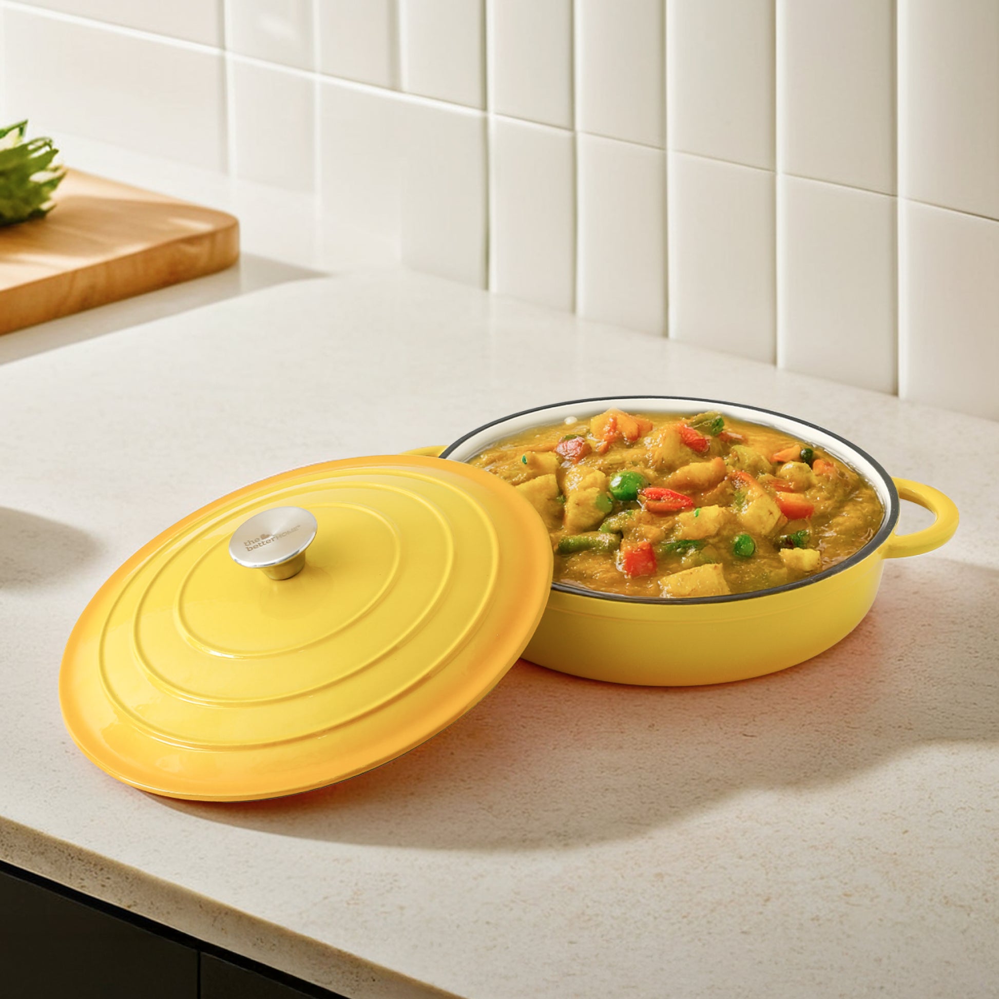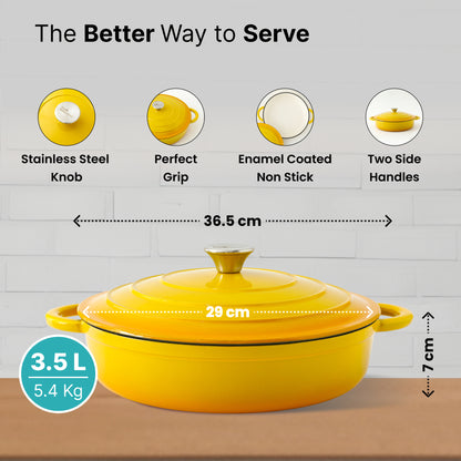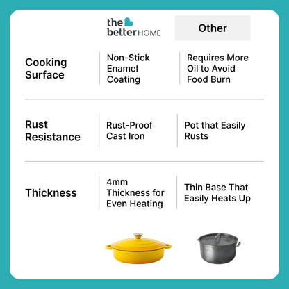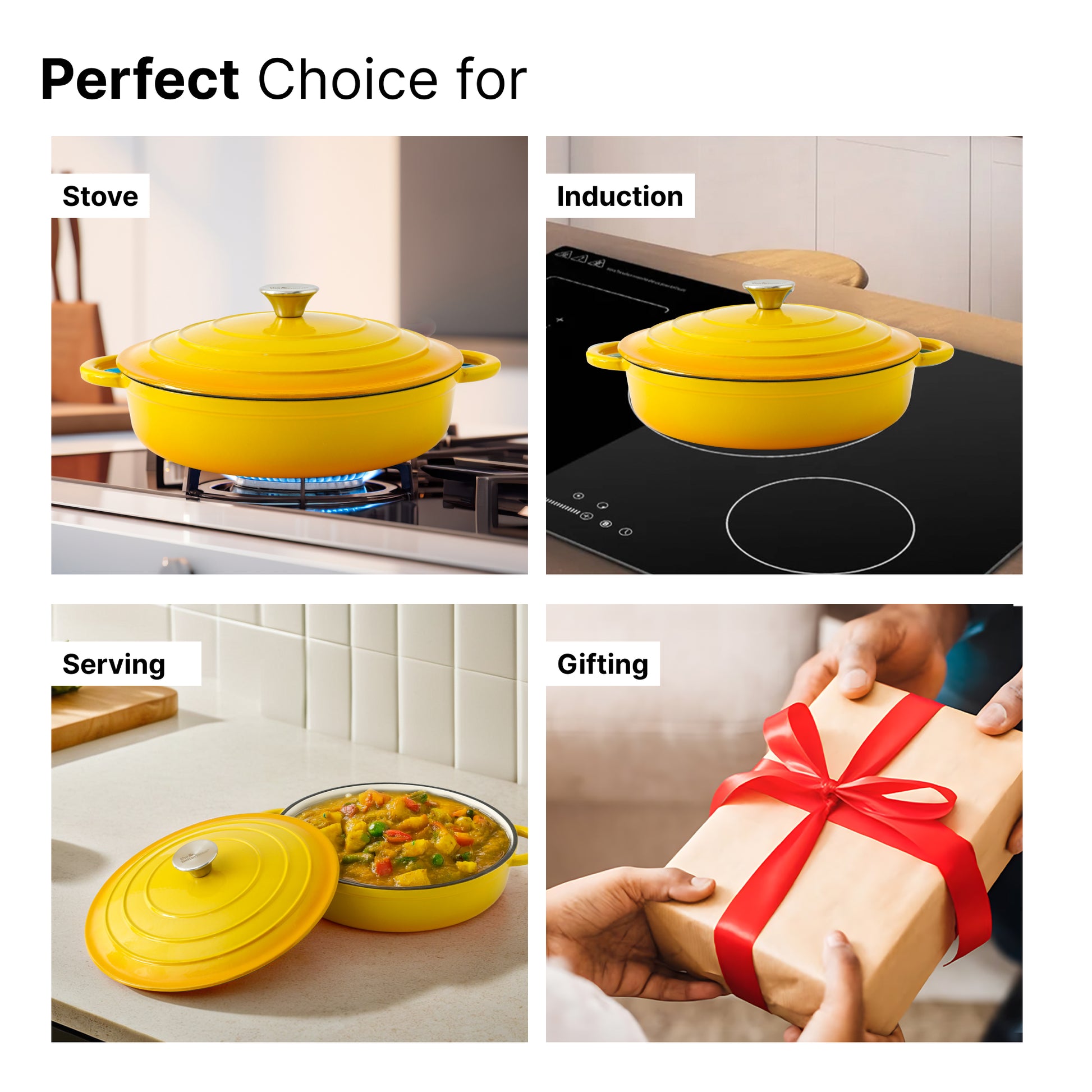 Introducing the Dutch Oven by Merhaki Foods and Nutrition Pvt. Ltd., expertly crafted from high-quality enameled cast iron. This versatile cooking pot is designed for everyone, particularly busy families, mothers, and wives looking to elevate their daily cooking experiences. With a generous capacity of 3400 ml and a vibrant red finish, it not only performs but also enhances kitchen decor.