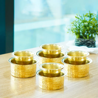 Introducing the Hammered Dabara Set by Ekhasa, a collection of 4 meticulously crafted brass coffee cups designed to elevate your coffee-drinking experience. Each cup has a capacity of 130ml, making it perfect for enjoying the rich traditions of South Indian filter coffee. With its elegant gold finish and traditional hammered design, this set not only enhances your coffee ritual but also adds a touch of sophistication to your kitchen.