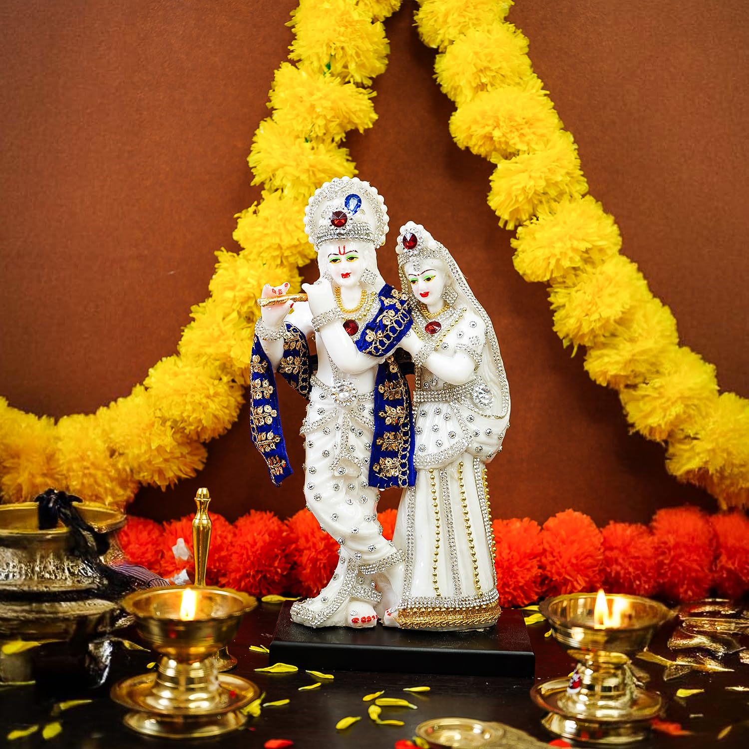Aura Series Marble Dust Radha Krishna Murti (8 inch, Medium Size) | Gemstone Zircon Studded Radha Krishna Statue | Resin Radha Krishna Idol | Radhe Krishna ki Murti for Pooja, White, Religious