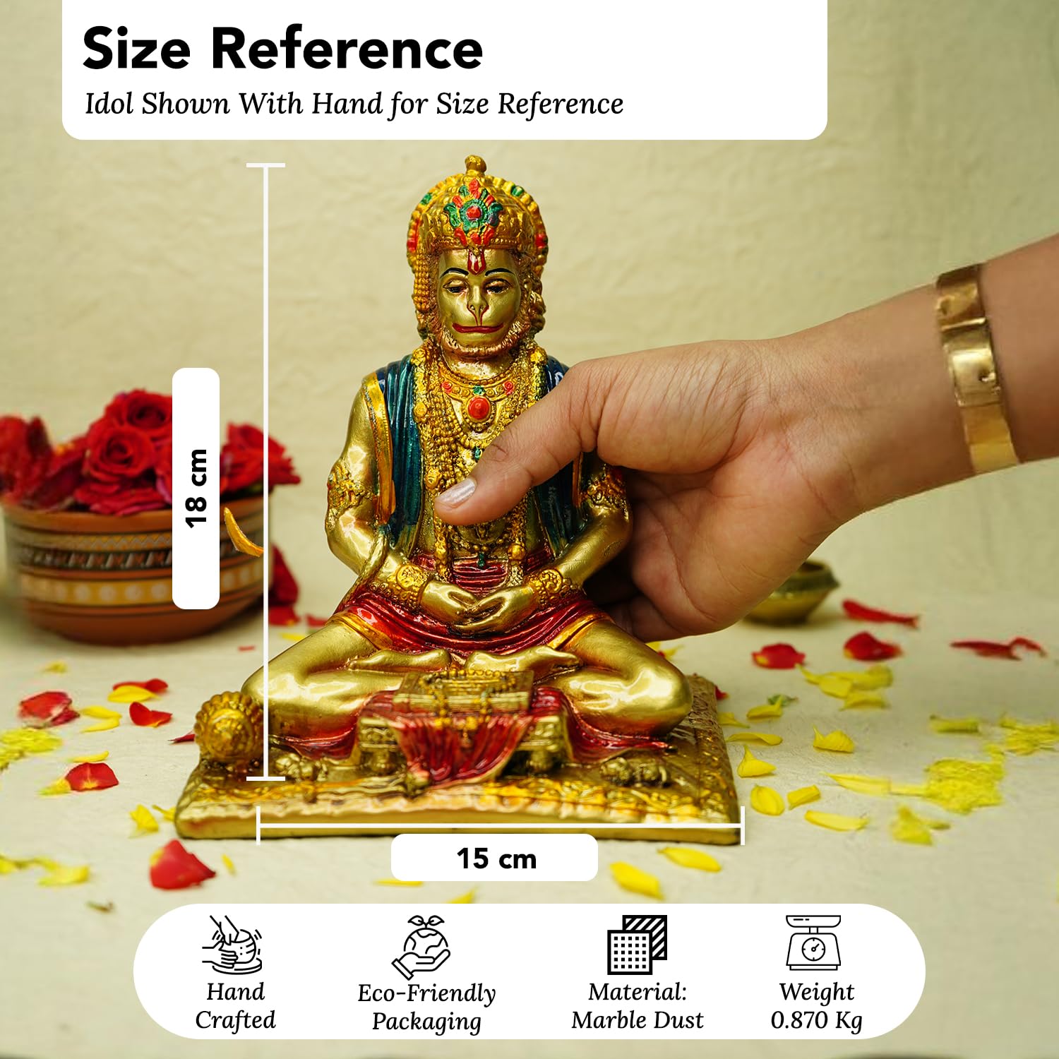 Whether adorning your puja room, enhancing your home decor, or gracing your office desk, the Hanuman Ji idol serves multiple purposes, inspiring those who encounter it. It can also be a thoughtful gift for occasions such as Diwali, birthdays, weddings, and housewarmings, enriching the lives of the recipients.