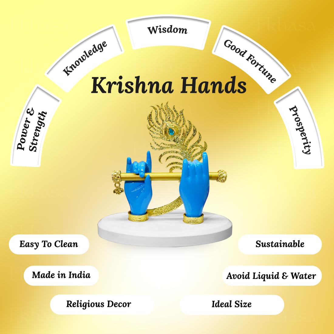 Introducing the Ekhasa Lord Krishna Hands with Flute Idol by Ekhasa, a stunning small-sized decorative accessory crafted from high-quality resin. This exquisitely designed idol, adorned with Krishna's _______ divine hands holding a flute and peacock feather, brings a touch of tranquility to any space. Perfect for enhancing your living room, car dashboard, or meditation corner, this beautifully crafted idol serves as a meaningful addition to your home decor.