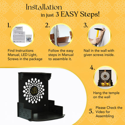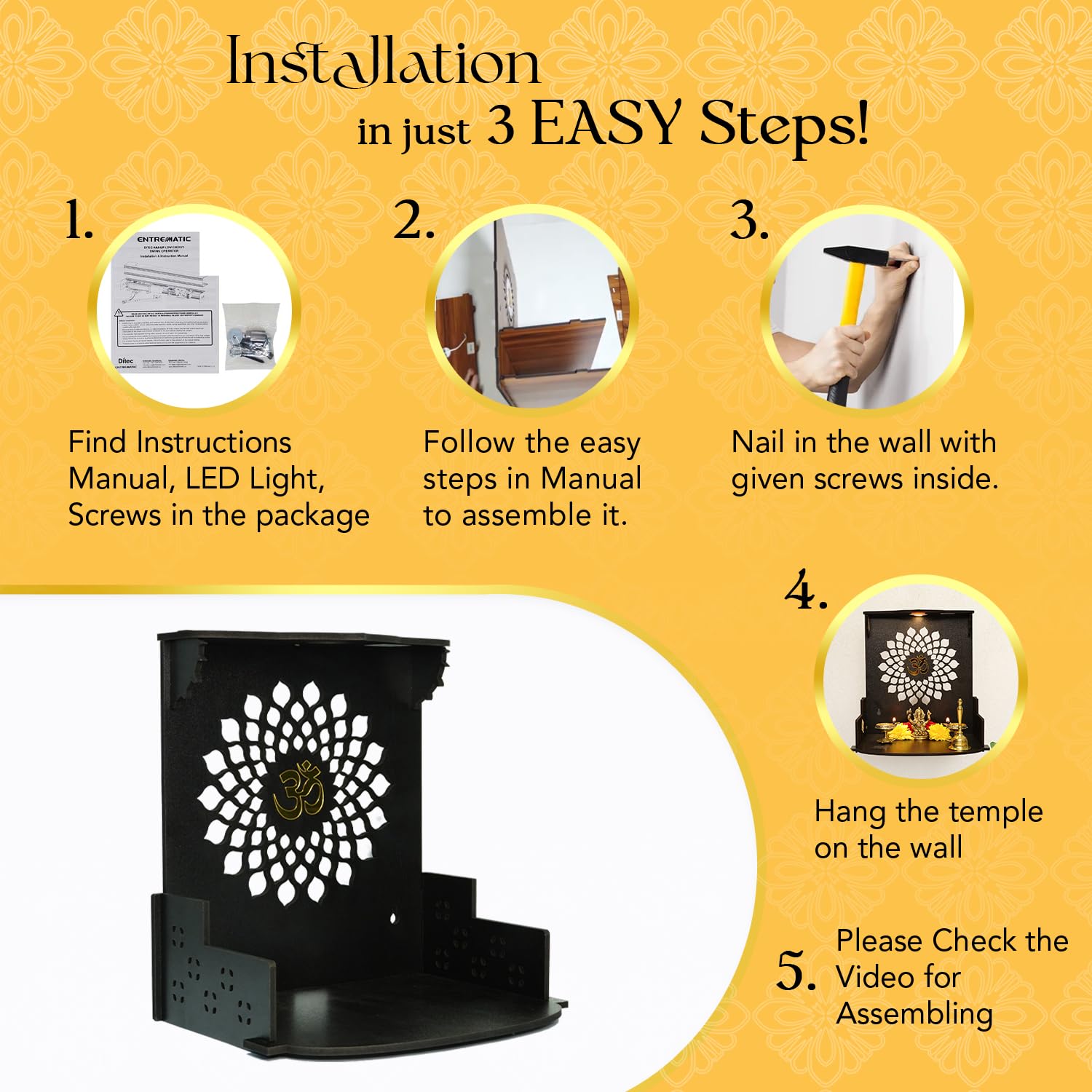 • Effortless Installation: With user-friendly assembly instructions included, setting up your pooja mandir takes less than a minute. The innovative design allows for tool-free assembly, simply insert one part into another with ease.