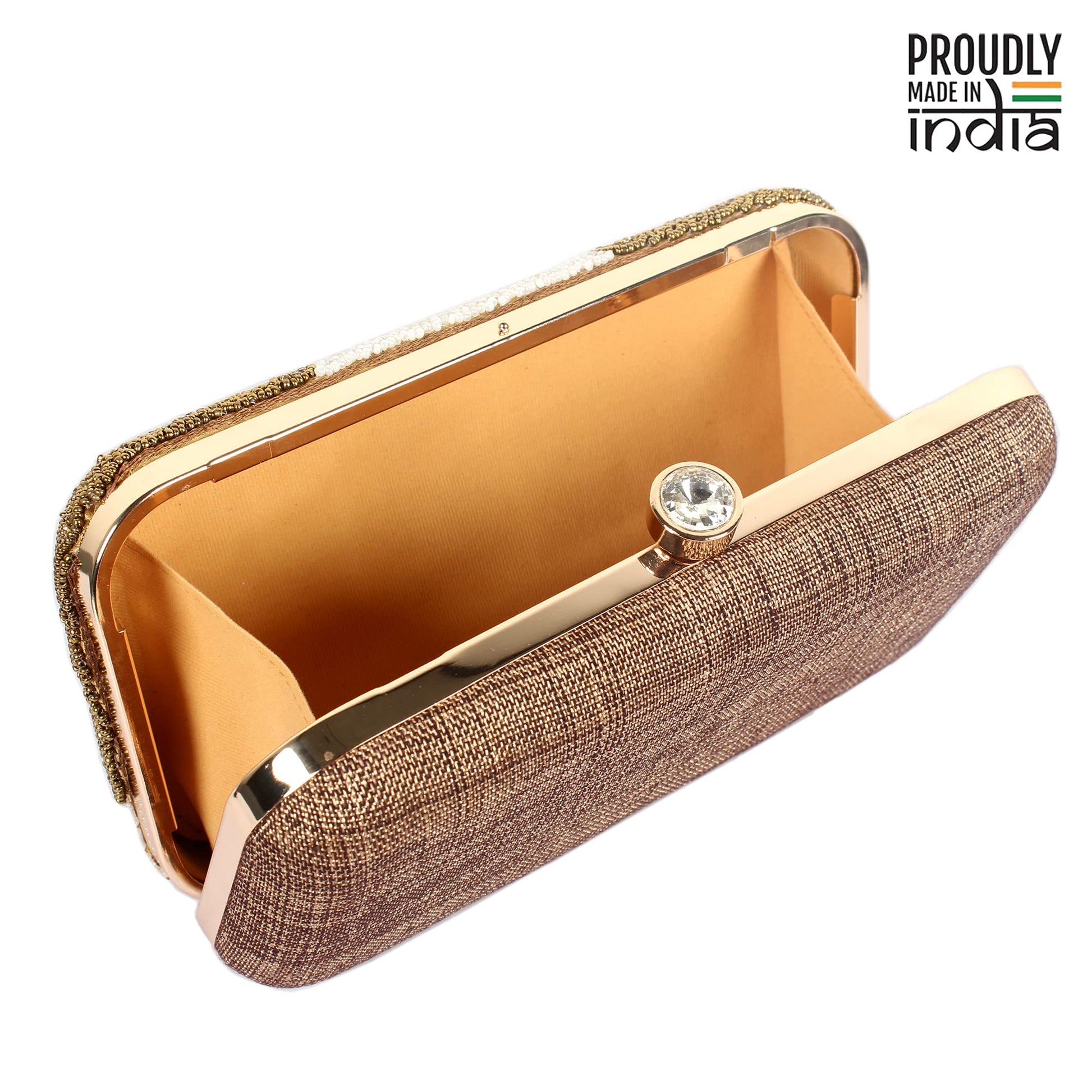 THE CLOWNFISH Senorita Collection Womens Party Clutch Ladies Wallet Evening Bag with Fashionable Round Corners Beads Work and Floral Embroidered Design (Brown)