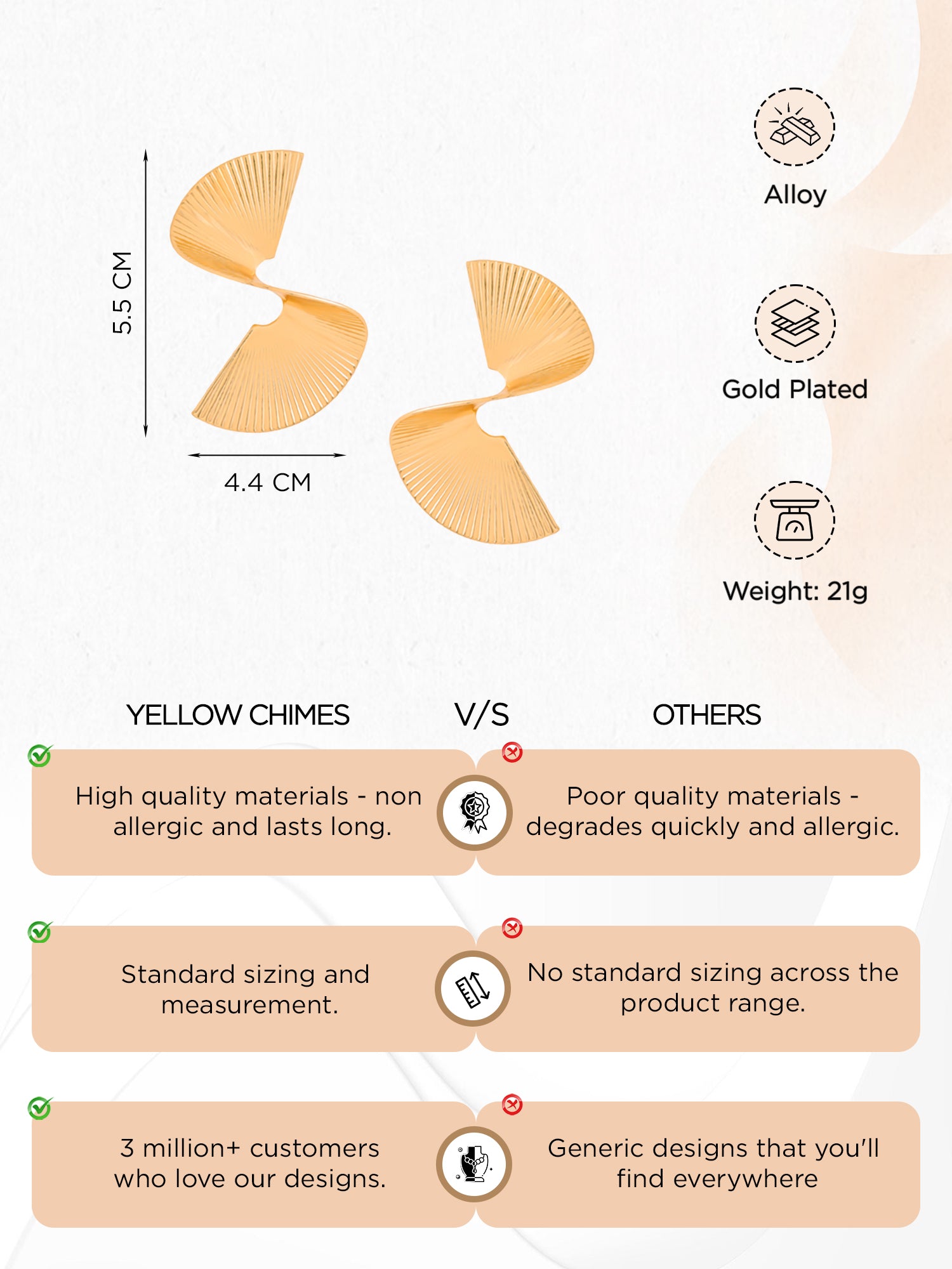 Introducing the Gold Plated Drop Earrings by Yellow Chimes, designed to elevate your accessories collection with style and sophistication. Crafted from high-quality lightweight alloy and plated in a radiant gold finish, these earrings feature a sleek twisted design that measures 5.5 cm in length and 4.4 cm in width. Perfect for various occasions, this elegant piece will enhance your outfit while ensuring comfort throughout the day.