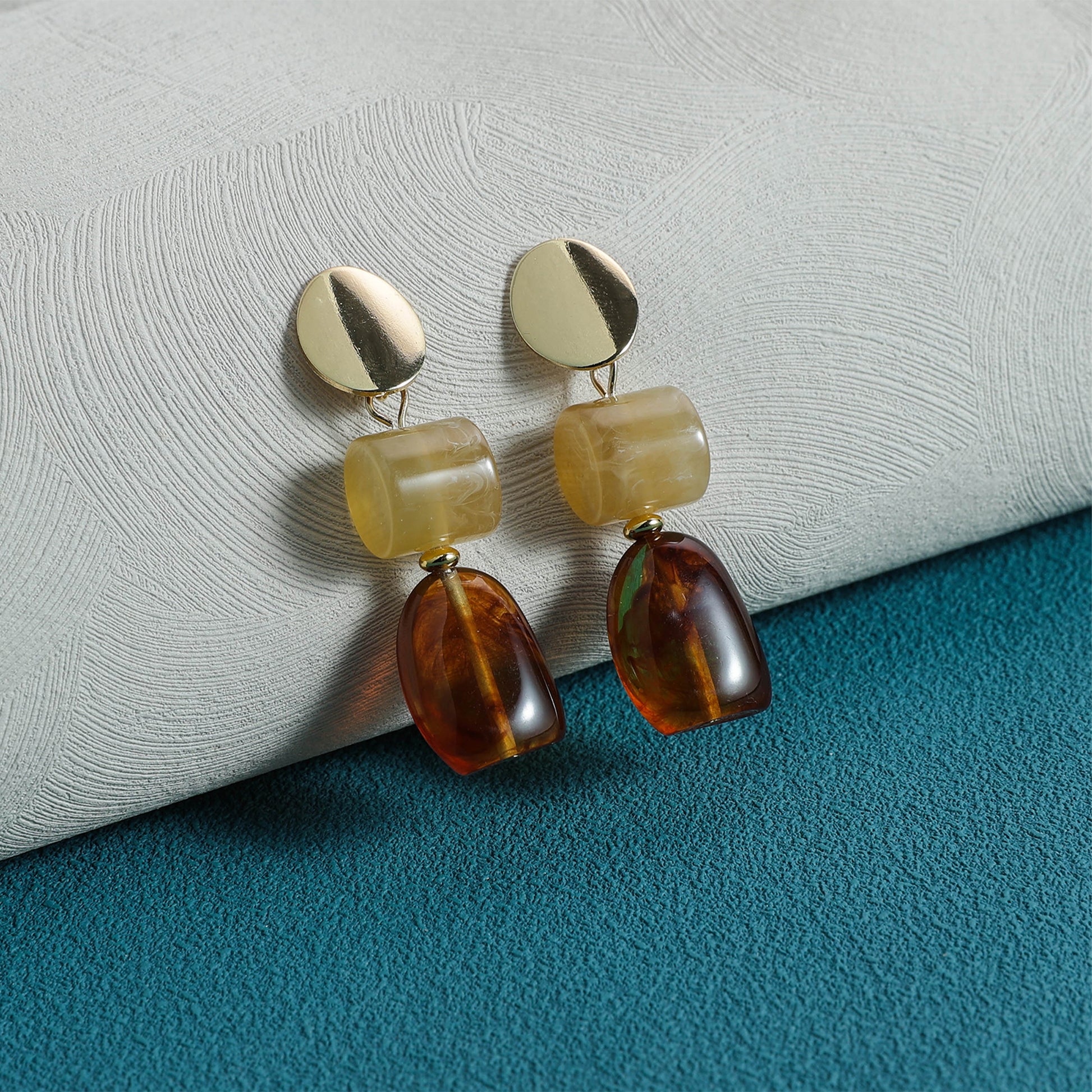 Introducing the Gold Plated Multicolor Stone Drop Earrings by Yellow Chimes, a stunning blend of artistry and elegance. These earrings feature a unique geometric design, masterfully crafted with a high-quality gold plated finish. With a weight of just 100 grams, they are incredibly lightweight, ensuring that you can wear them comfortably for extended periods. Perfectly sized for any occasion, these earrings skillfully combine metallic studs with translucent beads and a rich amber-toned drop, creating a stylish statement piece.