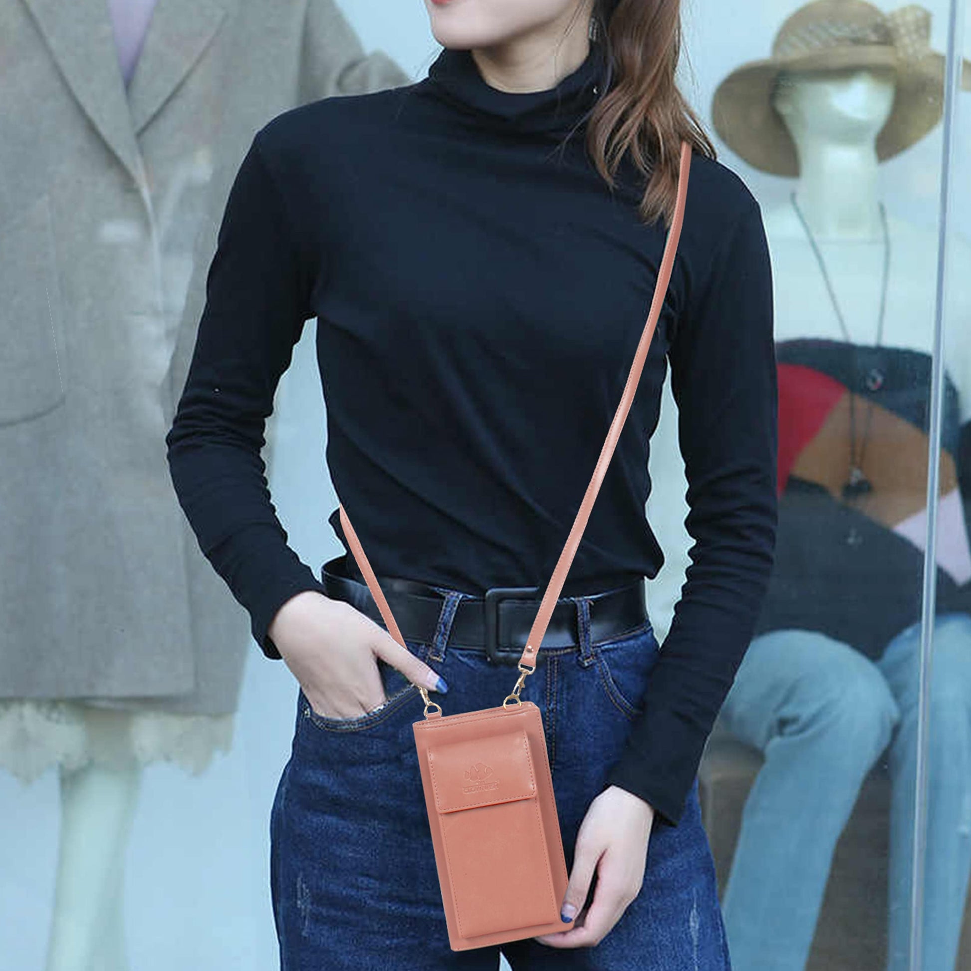 • CONVENIENT DESIGN: The main compartment features a secure snap closure and multiple card slots, accommodating debit, credit, and ATM cards, along with two ID card windows for easy access. It also includes a back zip pocket for additional storage and a removable slim shoulder belt to transform it into a sling bag.
