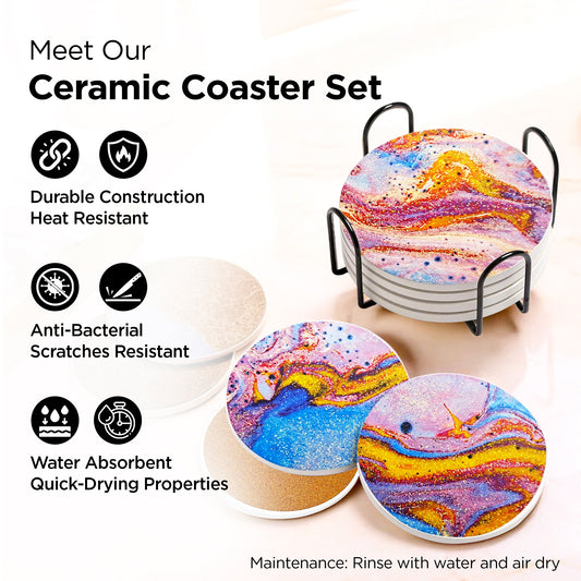 Ceramic Coasters Set of 6 (Dia - 10cm, 8mm Thick) | Dining Table Decor Accessories | Cups/Coffee Mugs/Glasses Coaster Set | Glass Cover Lid | Kitty Party Return Gifts for Women (Multicolor)