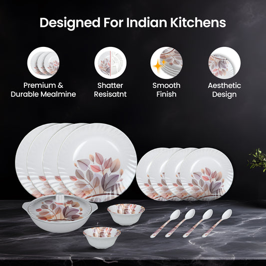 Melamine 40 Pcs Dinner Set | Crockery Set |6 Dinner Plates, 6 Small Plates, 1 Serving Tray, 3 Big Serving Bowls with Lid, 12 Small Bowls, 6 Spoons, 3 Serving Spoons (White Beige)