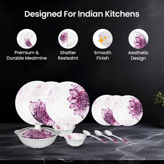 Melamine 40 Pcs Dinner Set | Crockery Set |6 Dinner Plates, 6 Small Plates, 1 Serving Tray, 3 Big Serving Bowls with Lid, 12 Small Bowls, 6 Spoons, 3 Serving Spoons (White Purple)