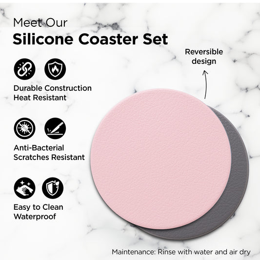 UMAI Tea Coaster Set of 6 with Stand (Dia- 9.8cm, Thick- 2mm)| Coasters for Dinning Table for Hot Pots | Non Slip Mat | Gift for Housewarming | Kitty Party Return Gifts for Women (Grey/Pink)