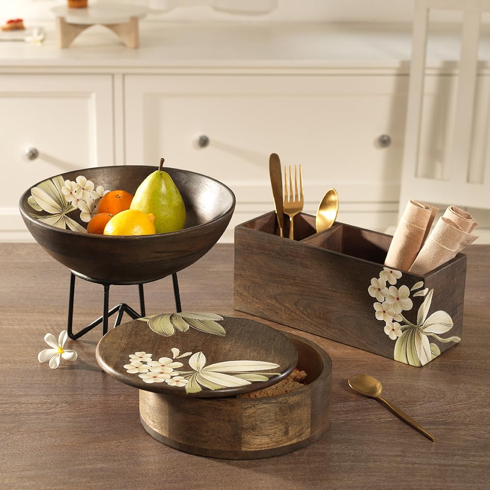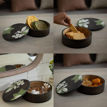 Elevate your kitchen aesthetic and impress your guests with this luxurious dinnerware piece. Choose the Ellementry Frangipani Wood Round Roti Box for an unforgettable dining experience!