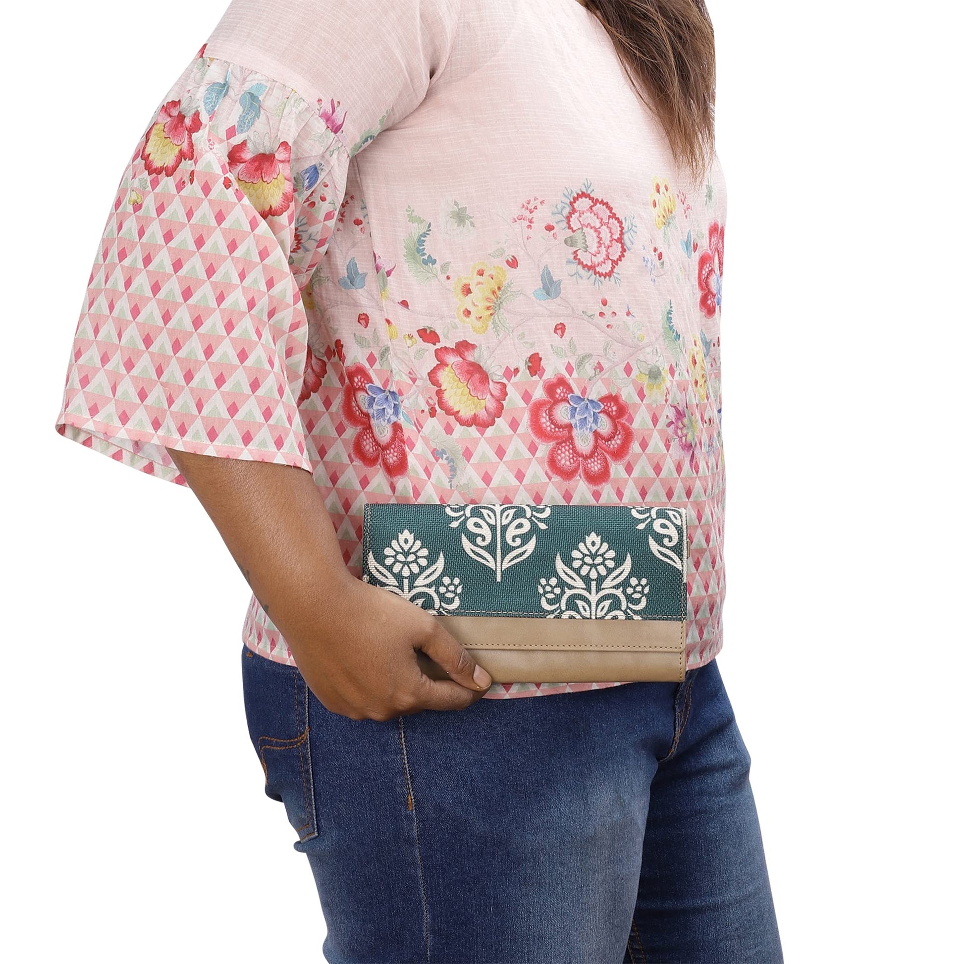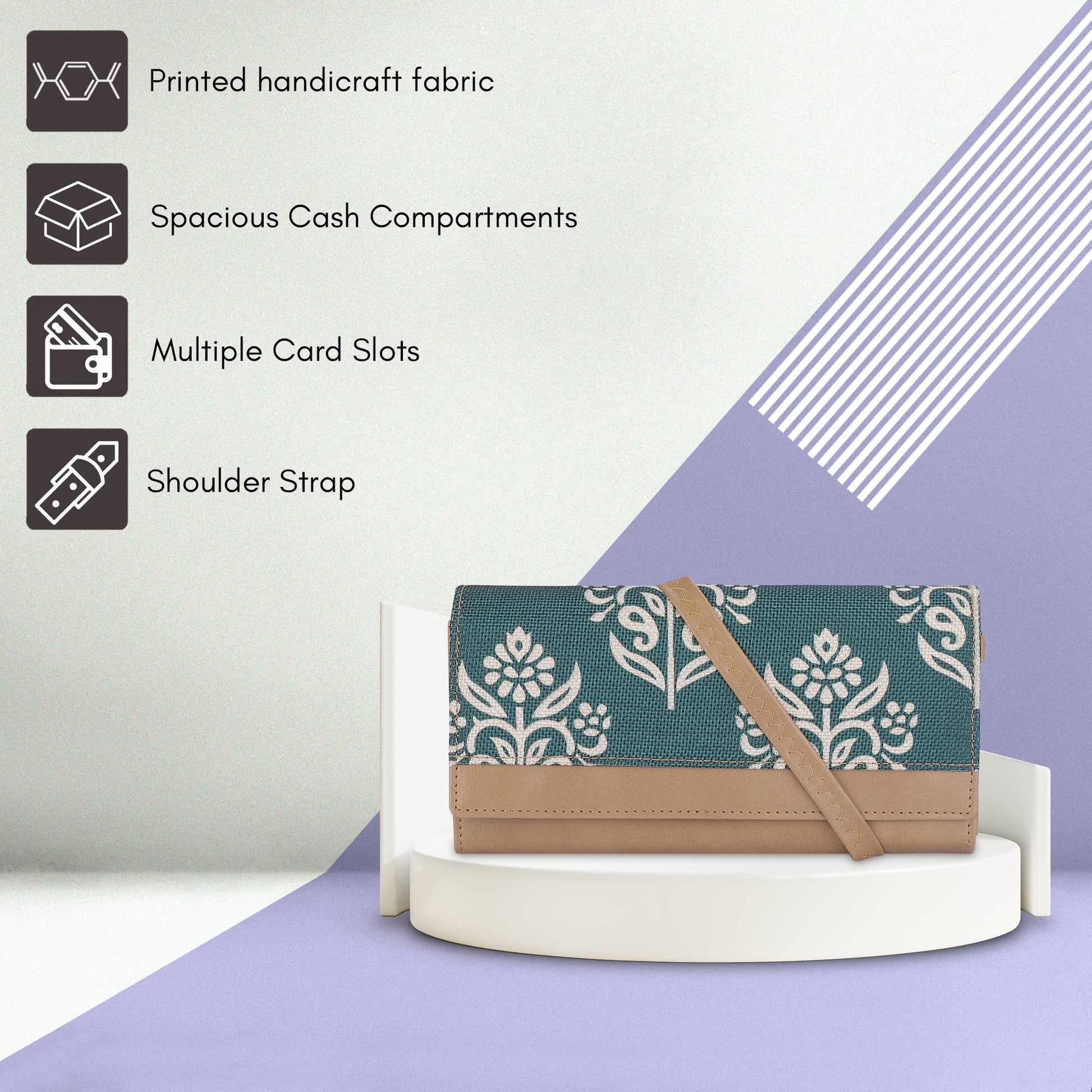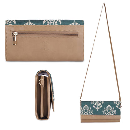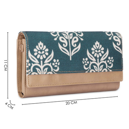 THE CLOWNFISH Erika Printed Handicraft Fabric & Vegan Leather Ladies Wallet Purse Sling Bag with Multiple Card Slots & Shoulder Belt (Light Green)