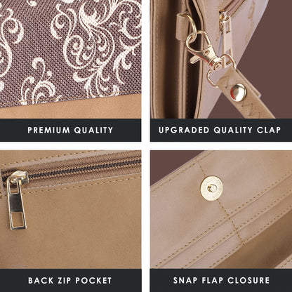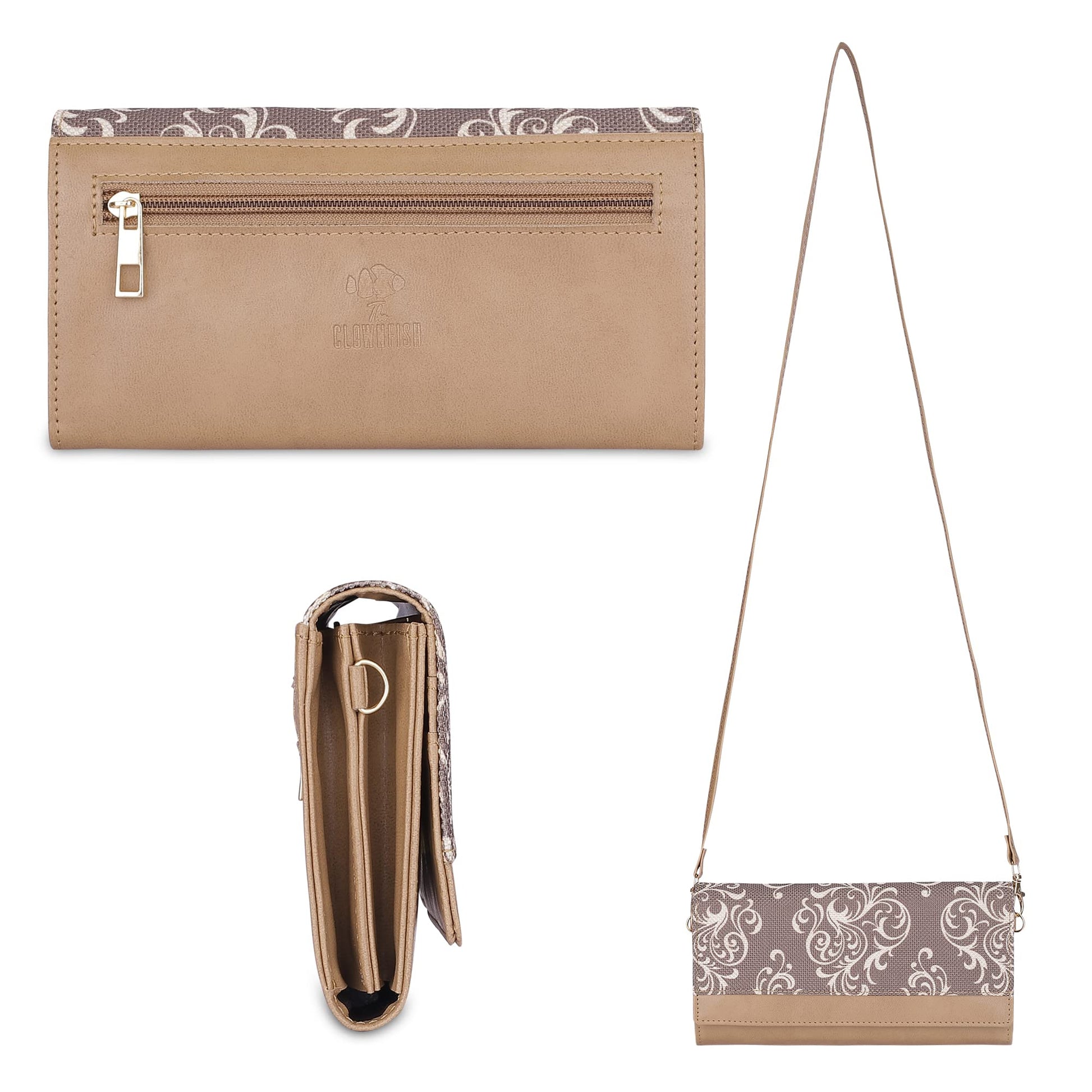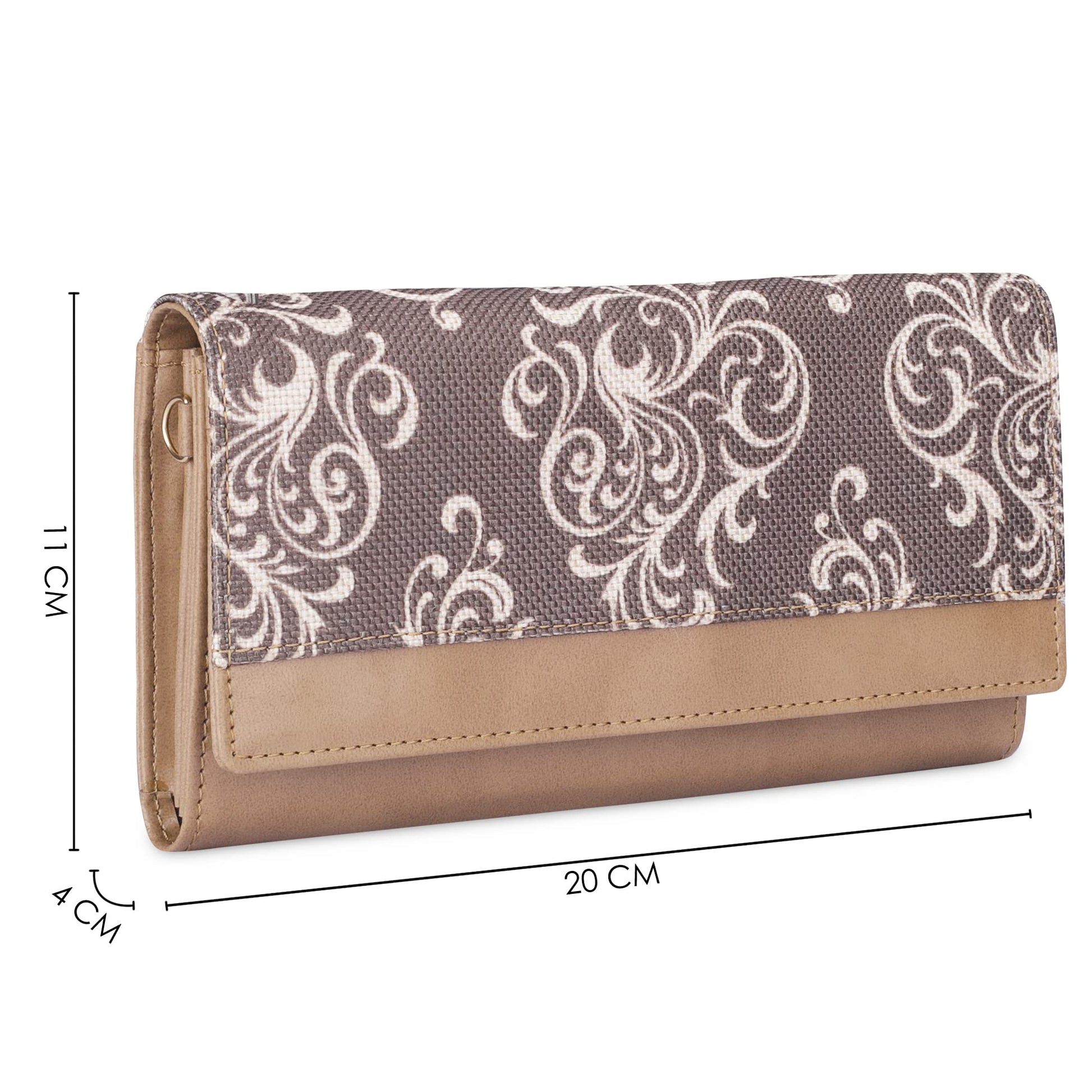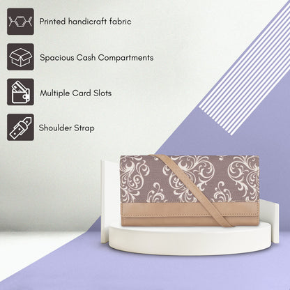 THE CLOWNFISH Erika Printed Handicraft Fabric & Vegan Leather Ladies Wallet Purse Sling Bag with Multiple Card Slots & Shoulder Belt (Brown)