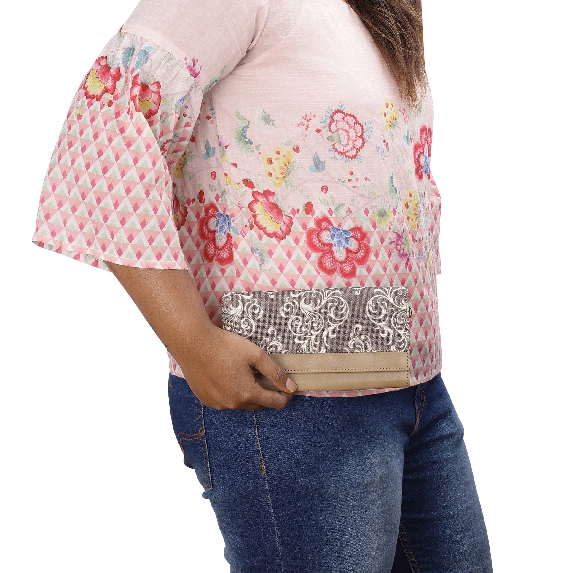 Introducing the Erika Printed Handicraft Fabric & Vegan Leather Ladies Wallet by Clownfish, where style meets functionality. This luxurious wallet is crafted from a combination of eye-catching printed handicraft fabric and rich vegan leather, making it a perfect accessory for any modern woman. With a sleek design, it features 2 spacious cash compartments along with a zip pocket for coins and essentials. The multiple card slots accommodate your debit, credit, and ATM cards with ease, ensuring you have everything at your fingertips. Plus, it comes with a stylish shoulder belt that allows you to carry it comfortably as a sling bag.