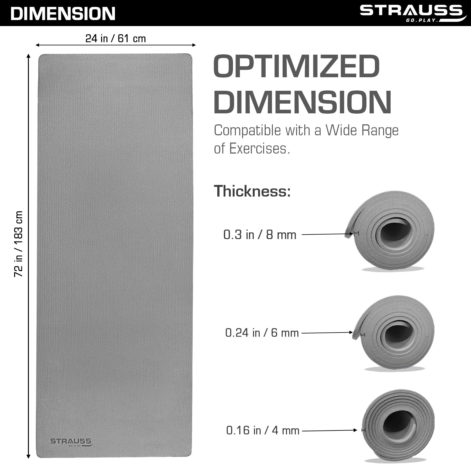 Introducing the Strauss Anti Skid EVA Yoga Mat with Carry Strap, your essential companion for all fitness routines. Measuring 6 feet (183 cm) long and 2 feet (61 cm) wide, this premium mat is designed to cater to individuals of all shapes and sizes. Crafted from high-quality Ethylene Vinyl Acetate (EVA) material, this 4mm thick mat provides the ideal combination of cushioning and support, ensuring your spine, hips, knees, and elbows are well-protected on hard floors.