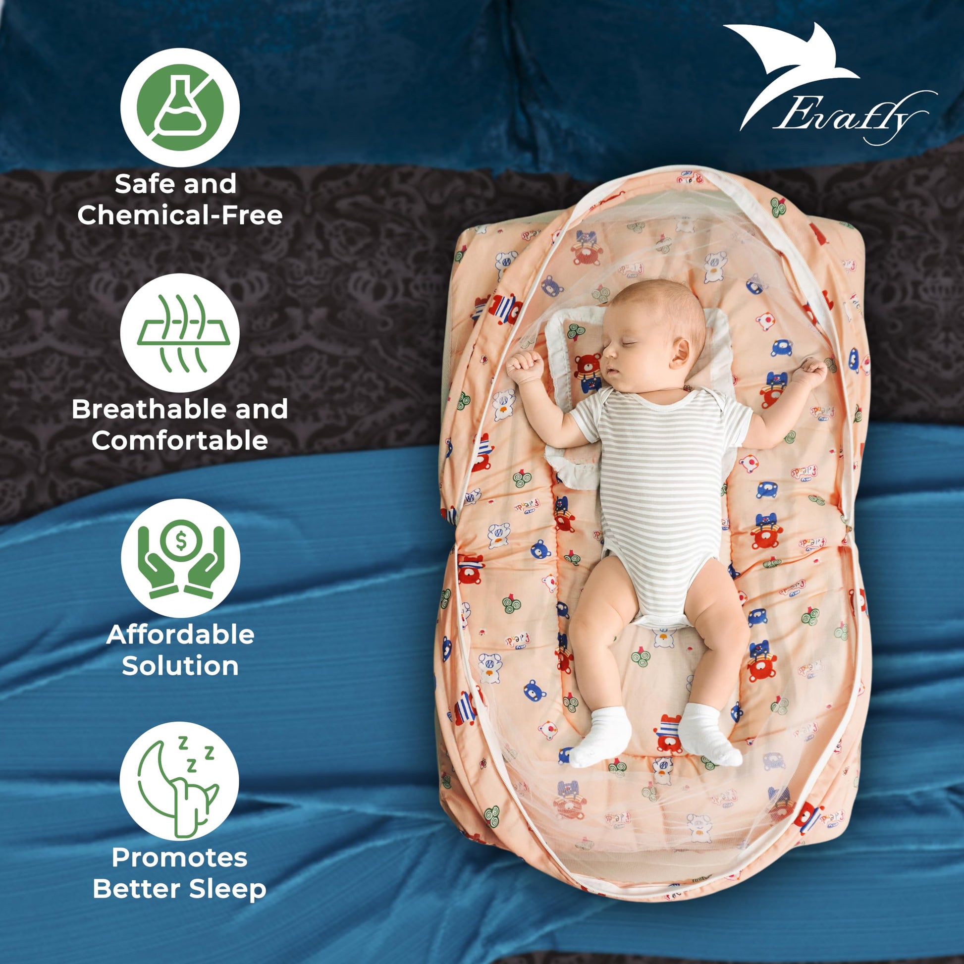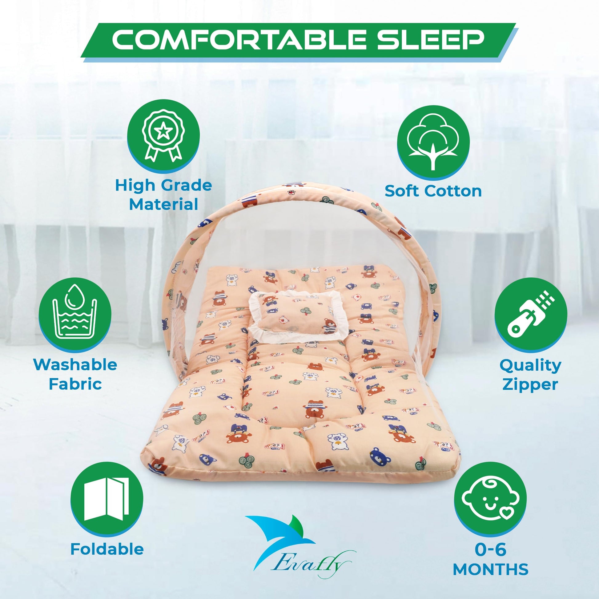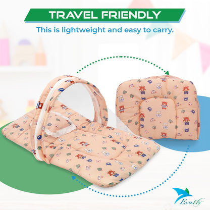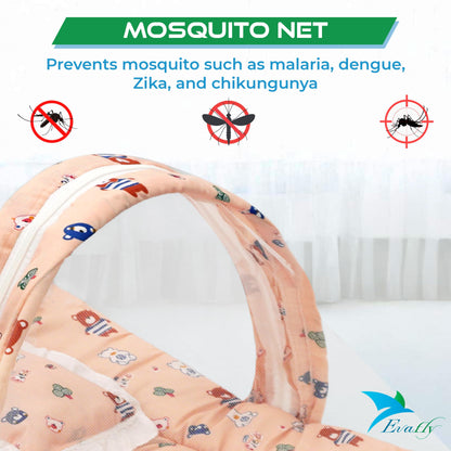 Introducing the Evafly Baby Mosquito Net with Cotton Bed (Peach), your ultimate solution for safe and peaceful sleep for infants aged 0-12 months. This complete bedding set includes a soft cotton mattress and a supportive neck pillow, all wrapped in a breathable mosquito net, creating a cozy, secure environment for your baby. The set size is 73cm x 44cm, making it perfectly suited for newborns. Lightweight and foldable, it’s designed for easy travel and storage. Featuring a cute teddy print, this mosquito net ensures your baby is protected from pesky insects whether at home or outdoors.