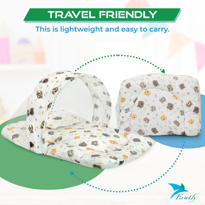 Introducing the Evafly Baby Mosquito Net with Cotton Bed in Cream, your ultimate solution for ensuring a safe sleeping environment for your baby aged 0-12 months. This complete bedding set includes a soft cotton mattress, a breathable mosquito net, and a supportive neck pillow, all designed to keep your little one comfortable and protected while they sleep. The dimensions of the set are L 73cm x W 44cm, making it perfectly suited for newborns. The lightweight and foldable design allows for easy storage and travel, while the secure zipper provides quick access to your baby. Featuring a delightful Bear Print, this portable mosquito net is ideal for both indoor and outdoor settings, safeguarding your infant against mosquitoes and other insects.