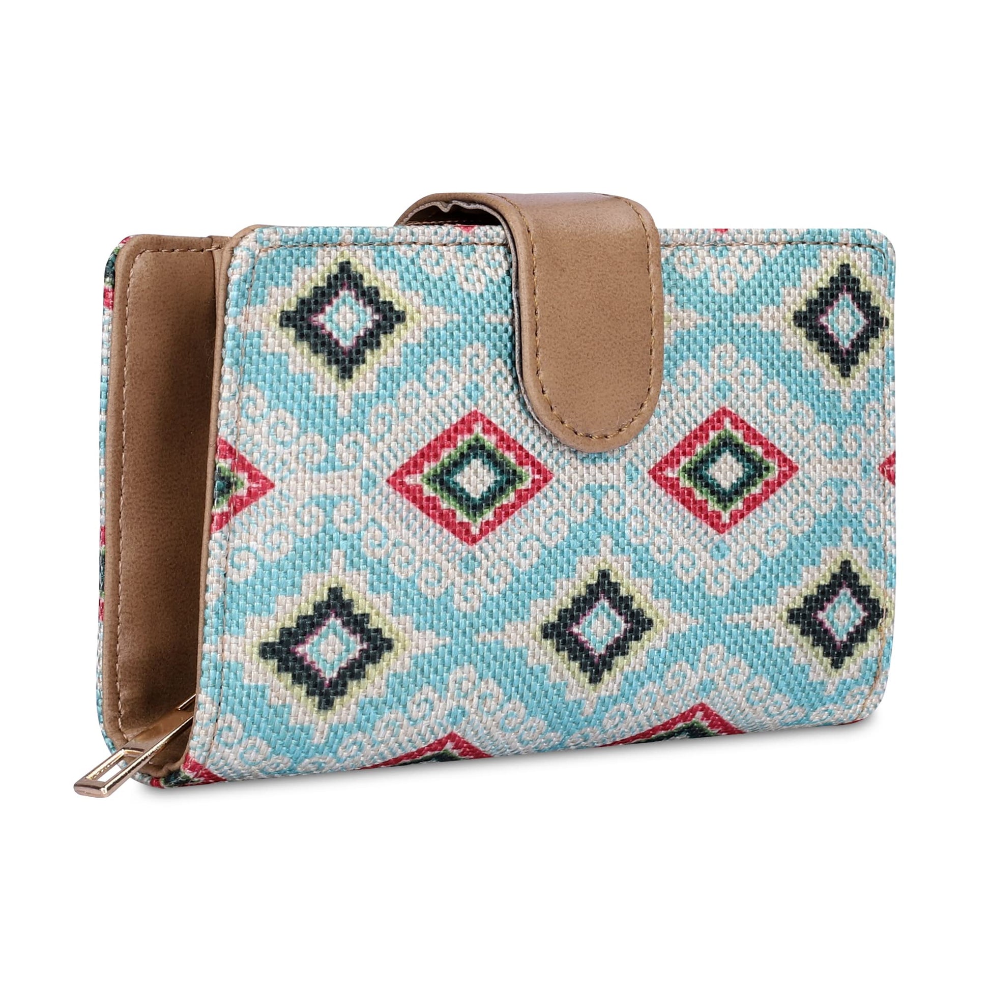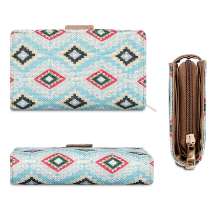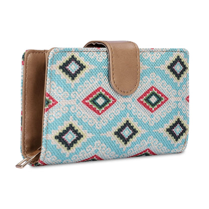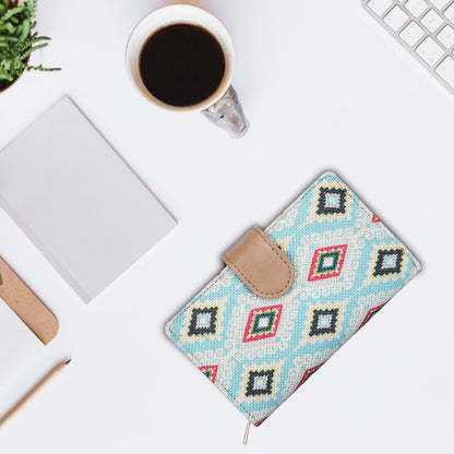 THE CLOWNFISH Fab Series Printed Handicraft Fabric & Vegan Leather Ladies Wallet Clutch Purse for Women Girls with Multiple Compartments (Sky Blue-Diamond Design)