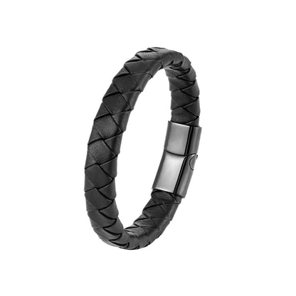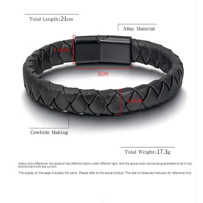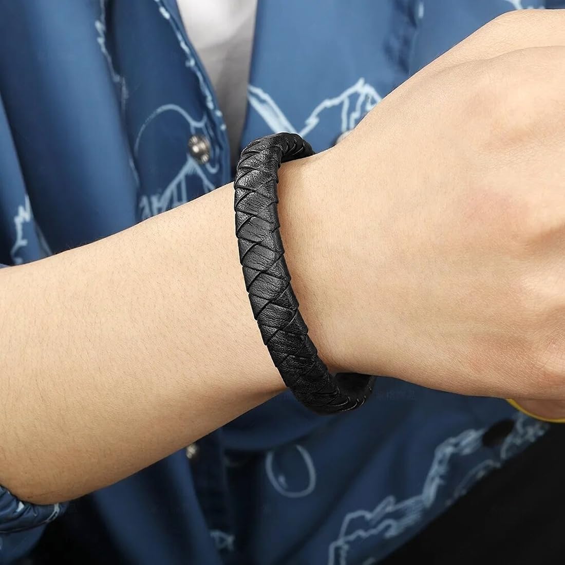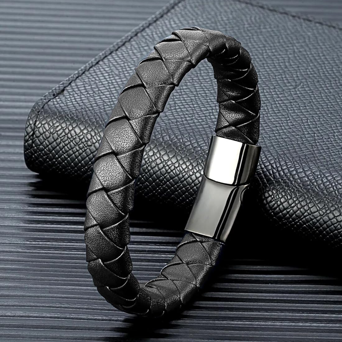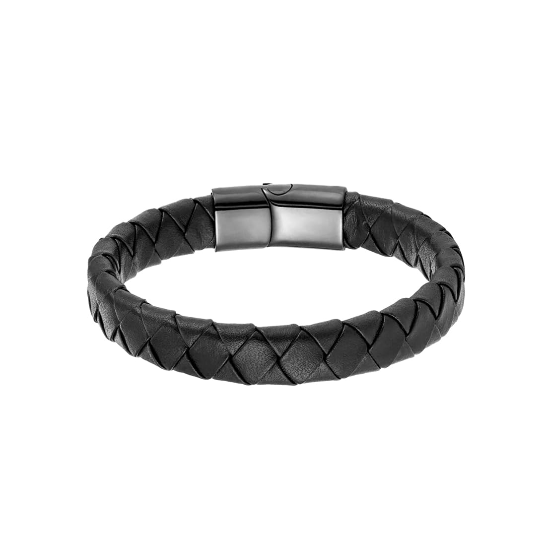 Fashion Black Leather Bracelet for Men | 21 cm | Magnetic Clasp | Black