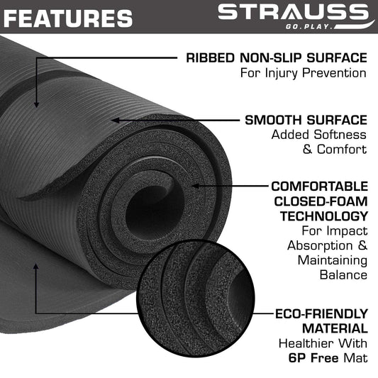STRAUSS Etra Thick Yoga Mat| Exercise Mat for Yoga,Pilates & Gym| Lightweight & Eco-Friendly Material | Yoga Mat for Women and Men |Ideal for Home Gym Workout |Includes Carry Strap | 13MM,(Black)