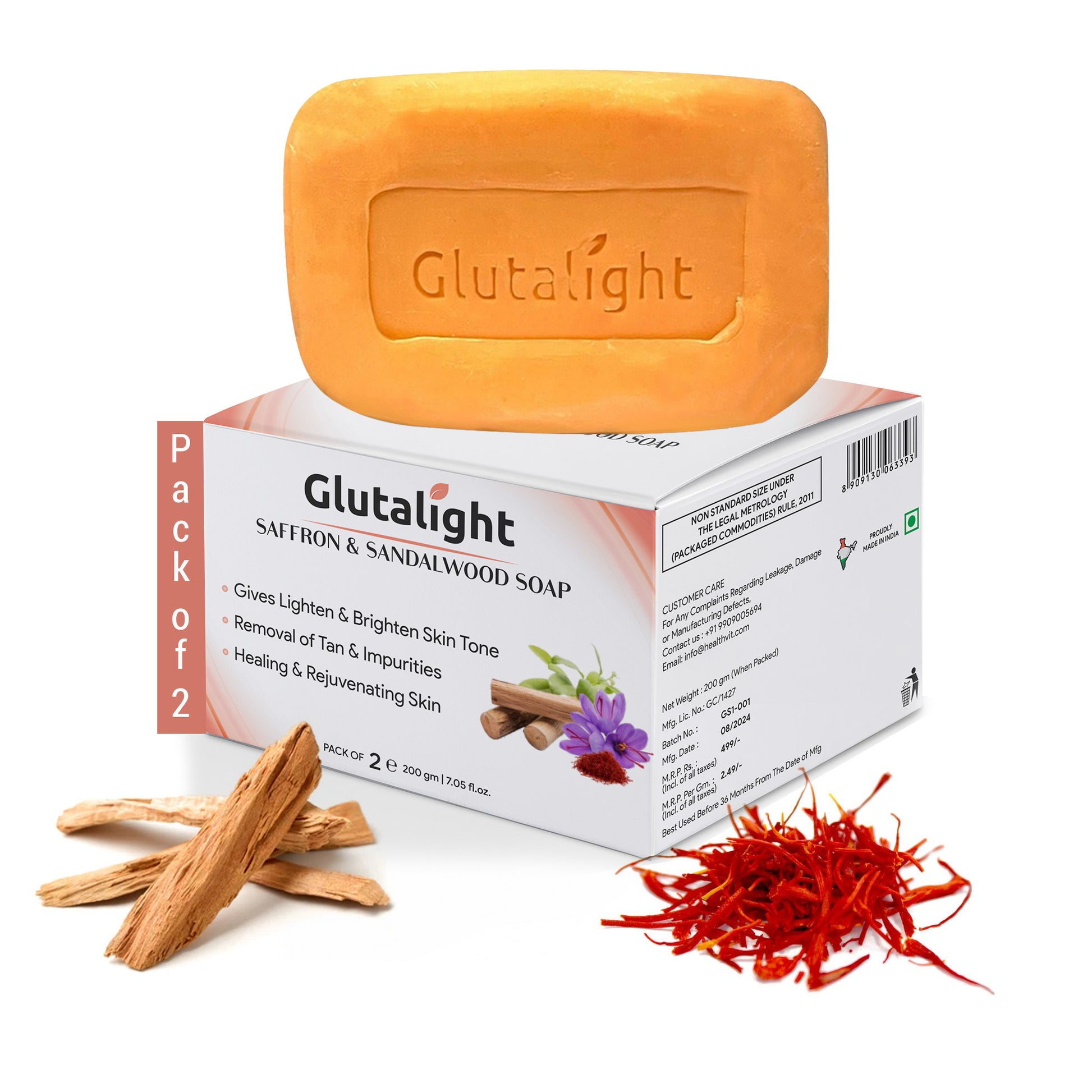 Glutalight Saffron & Sandalwood Soap |Tan Removal Soap| Hydrates, Soothes, & Cleanses Gently | Fades Pigmentation & Dark Spots | Nourishing Body Soap for All Skin Types - Pack of 1 Radiance-Boosting: Saffron's high antioxidant content, including vitamins A, C, and E, helps combat oxidative stress, neutralize free radicals, and restore a youthful, radiant glow to your skin. Refreshing Fragrance: Infused with a subtle, refreshing scent of saffron and sandalwood, this soap enhances your bathing routine with a touch of elegance and relaxation, turning each bath into a luxurious experience. Anti-Aging Benefits: Saffron stimulates collagen production, enhancing skin elasticity and firmness. This reduces the visibility of fine lines and wrinkles, leading to a smoother, more youthful-looking skin. Deep Hydration: Sandalwoodâ€s natural oils provide intense moisture, preventing dryness and keeping the skin soft and supple. Its moisturizing properties are ideal for maintaining hydration in all skin types, especially dry or sensitive skin. Versatile Use: Ideal for both men and women, Glutalight Saffron & Sandalwood Soap is a versatile addition to any skincare routine. Its blend of nourishing ingredients and gentle formula makes it suitable for everyday use, delivering consistent, visible results.