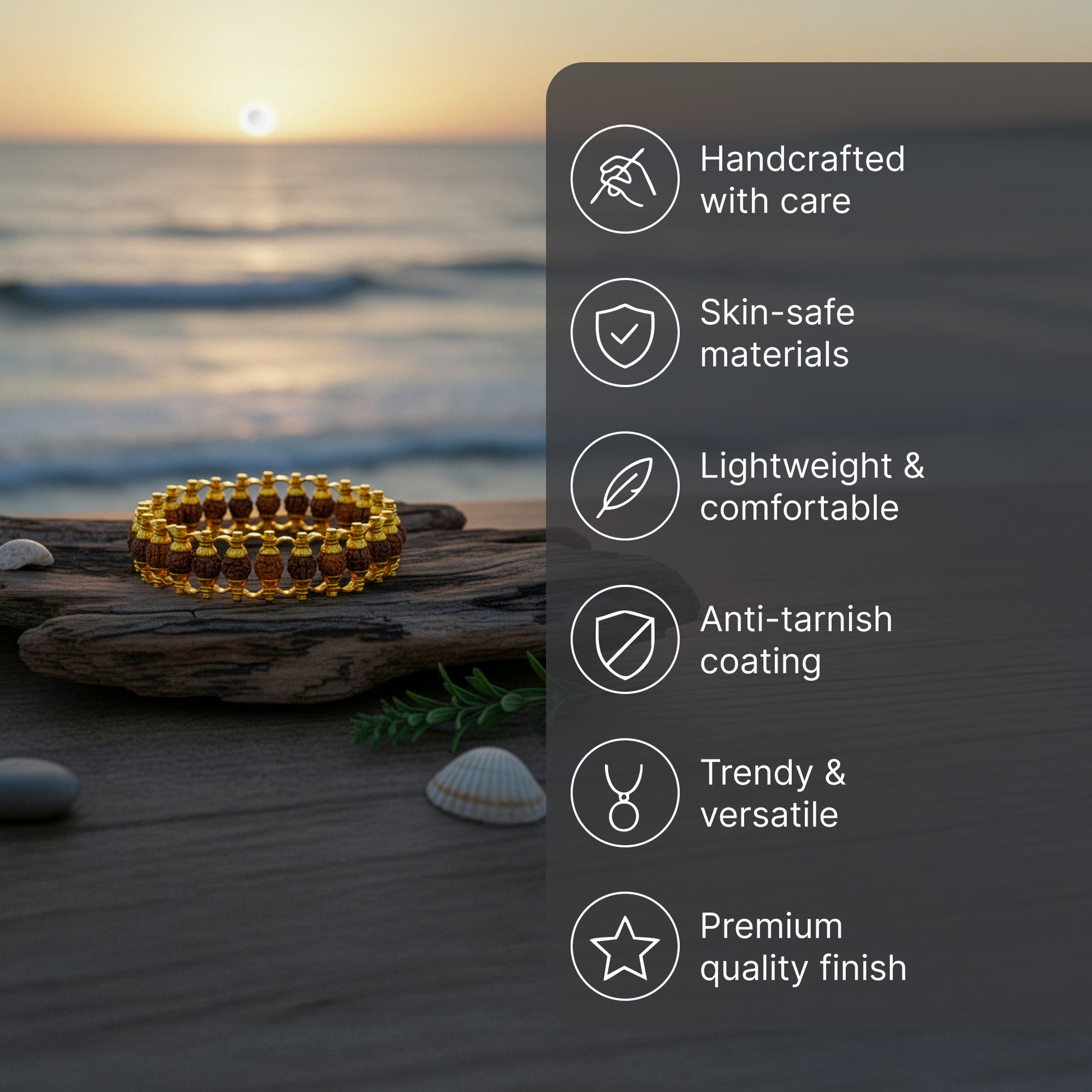 • Elegant Design: Stylish gold plating combined with natural rudraksha beads.