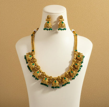 Green Stone Antique Gold Plated Jhumka Set: Elegant Necklace & Earrings | Free Size | Temple Inspired | Gold