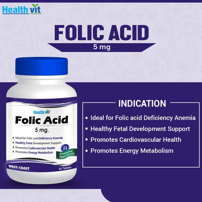 Healthvit Folic Acid 5mg For Heart Health | Ideal for Folic acid Deficiency Anemia | Promotes Energy Metabolism | Healthy Fetal Development Support | Vegan And Gluten Free | 60 Tablets
