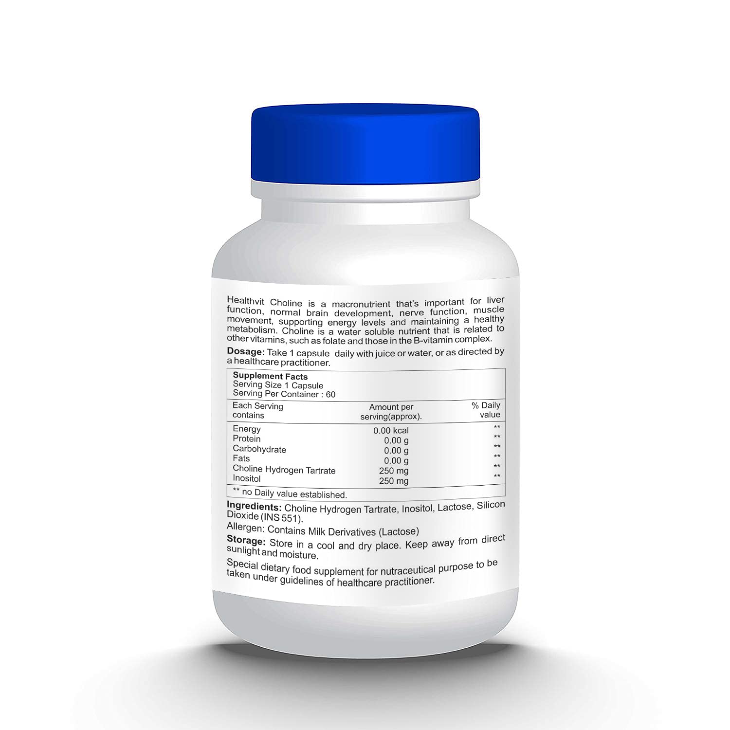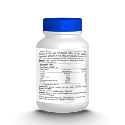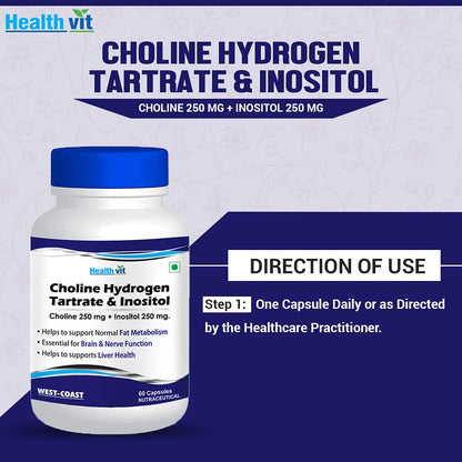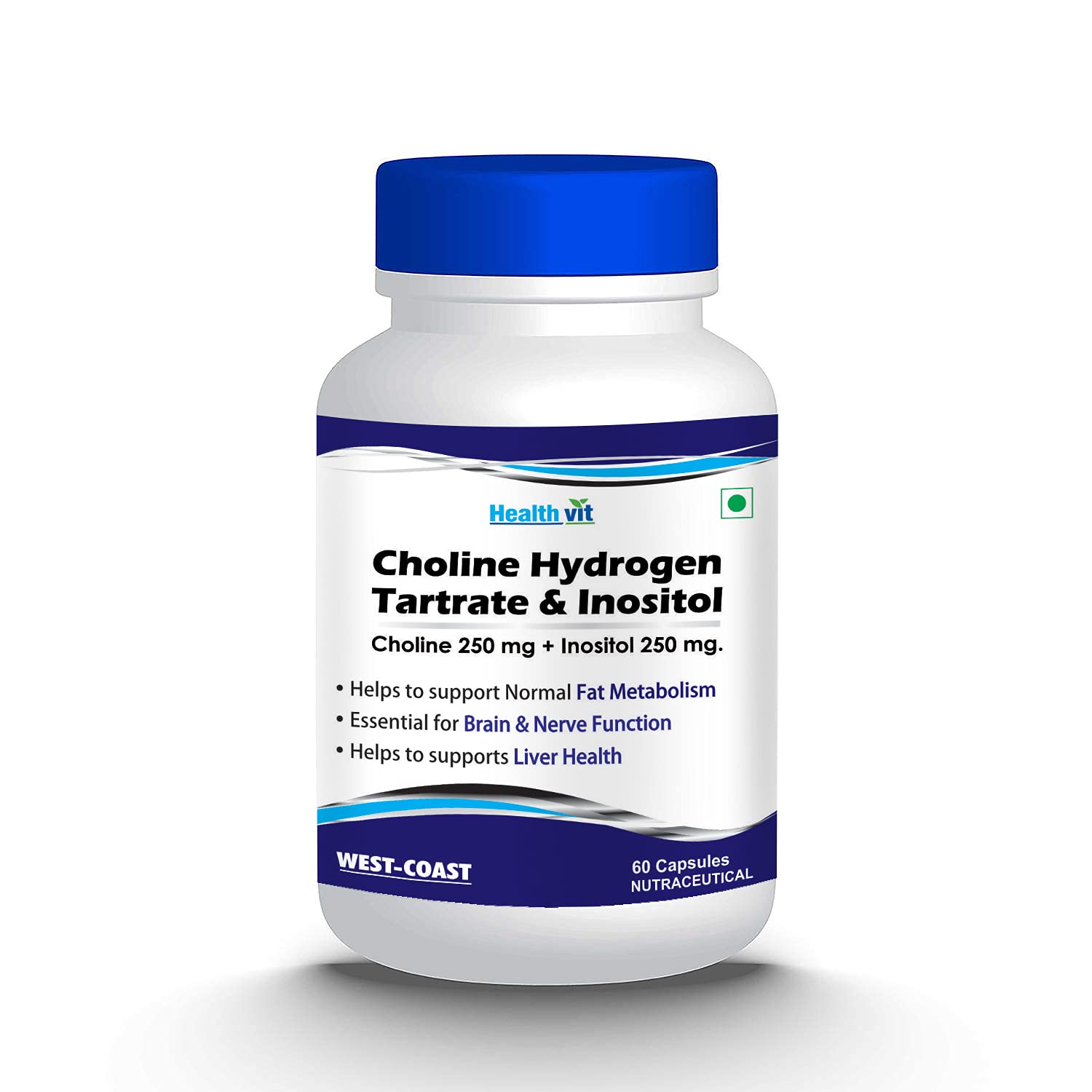 Healthvit Choline Hydrogen Tartrate 250mg & Inositol 250 Mg | Energy Metabolism, Liver Health, Essential for Brain & Nerve Function | Non-GMO, Vegan, Gluten Free, Dairy Free | 60 Capsules