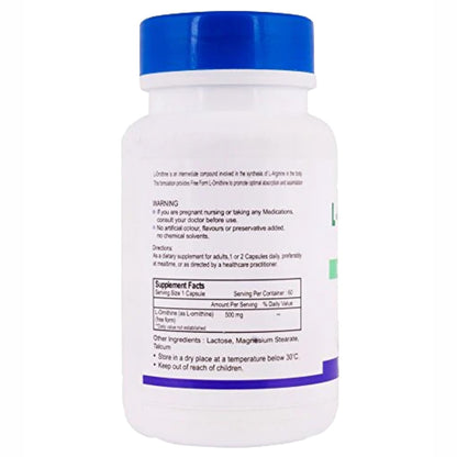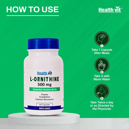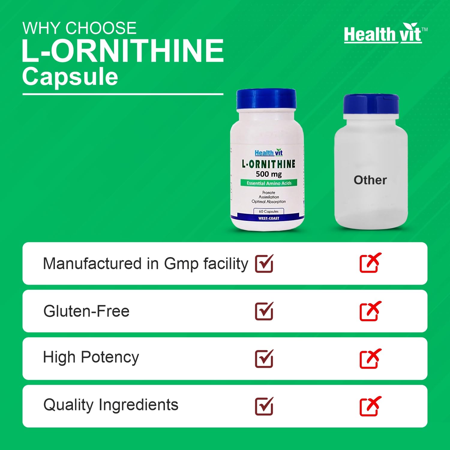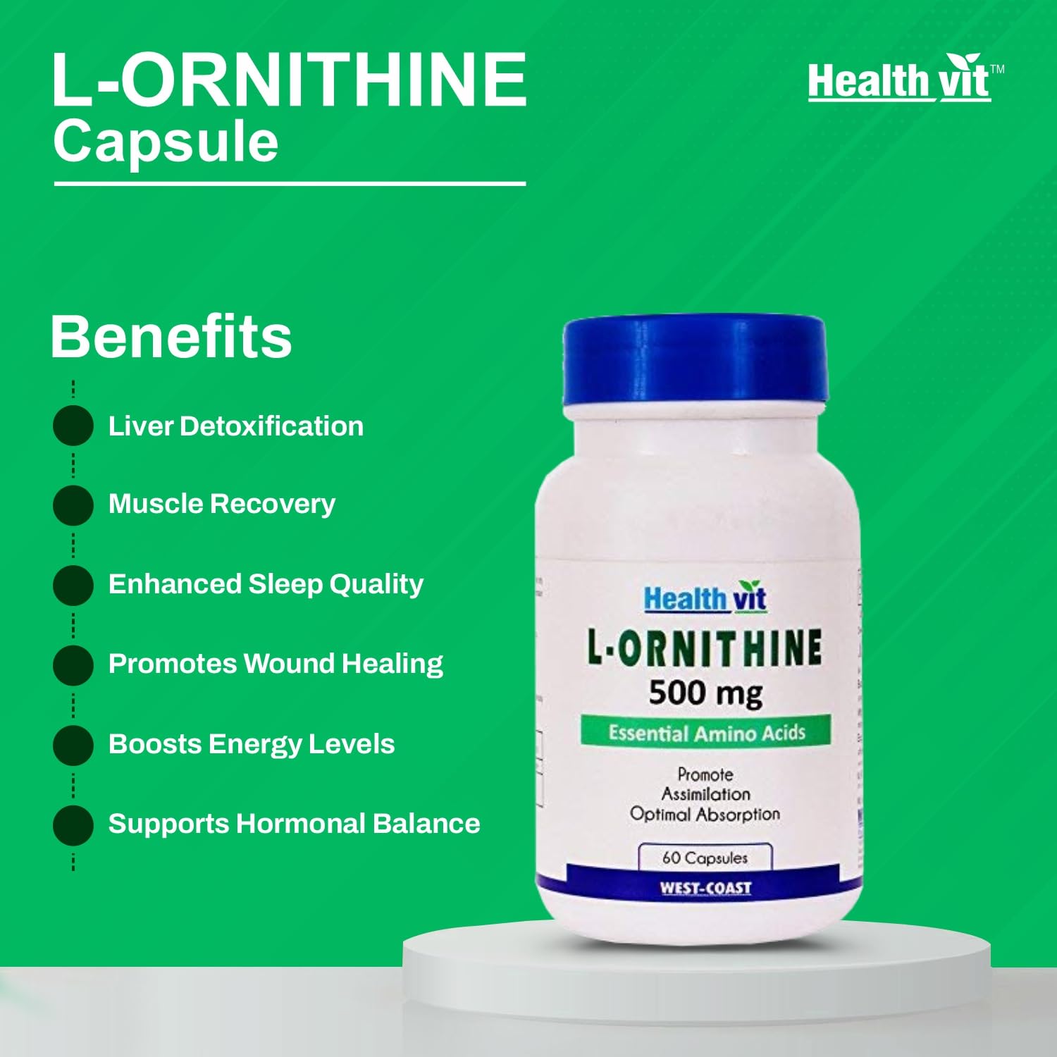 Healthvit L-Ornithine 500mg - Essential Amino Acid | Promote Optimal Absorption | Vegan, Gluten Free And Non-GMO | 60 Capsules