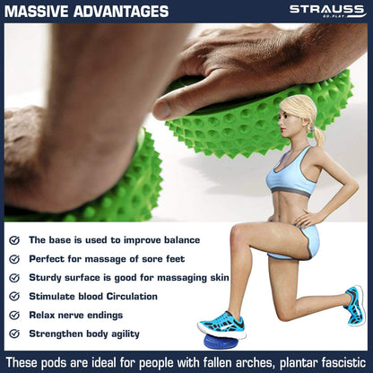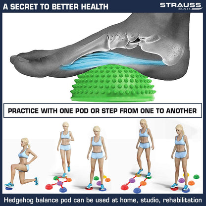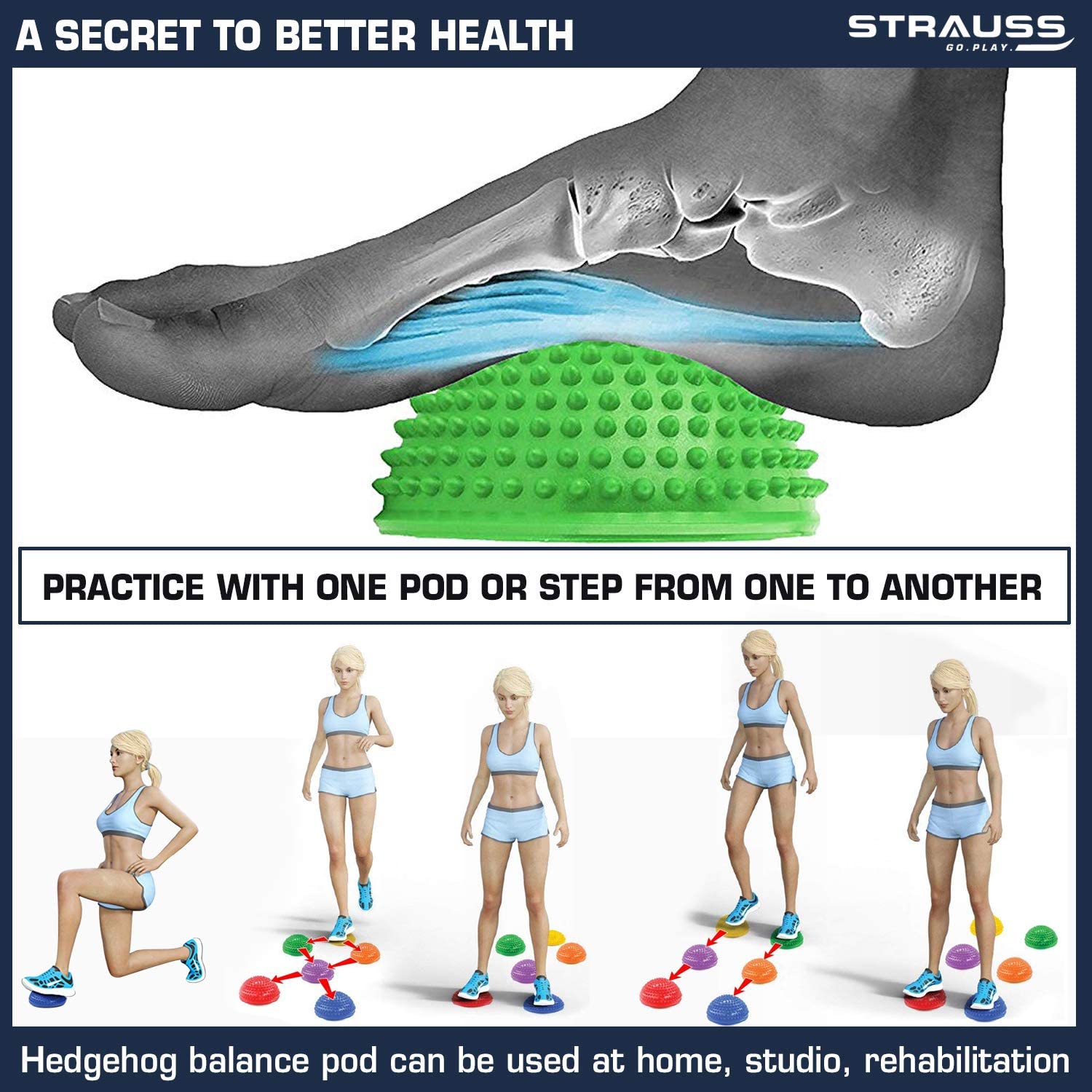 Strauss hedgehog balance pod feature with raised massaging bumps on one side to maximize massaging effect, stimulate feet, boost circulation and ease pain while the smooth flat bottom provides stability and balance. These balance pods are ideal for people with fallen arches, plantar fascistic, sore feet, reflexology, bunions and hammertoes.