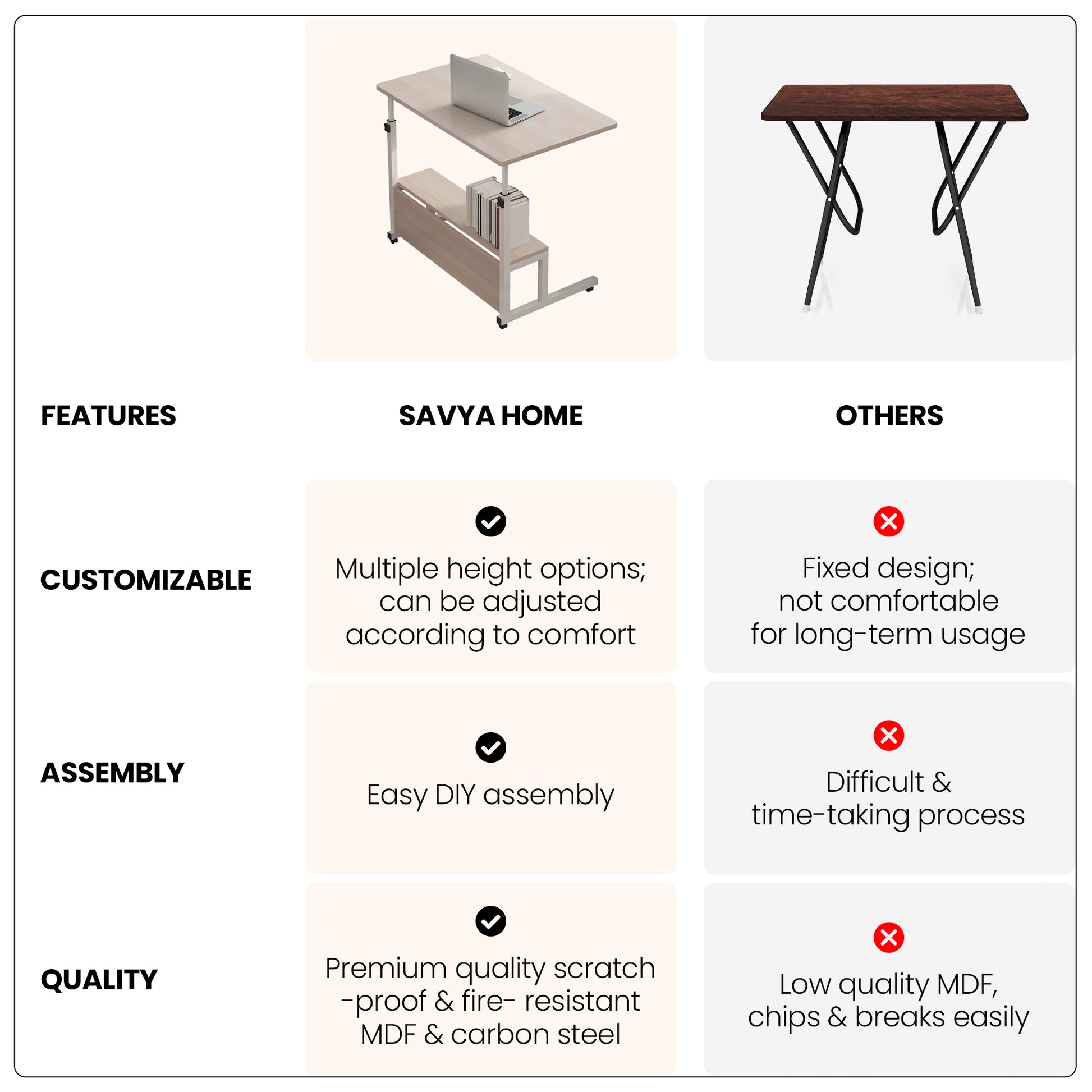 This SAVYA HOME Height Adjustable Table is designed for students, professionals, and anyone in need of an adaptable workspace. Upgrade your working environment today with a desk that embodies efficiency, functionality, and style!