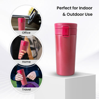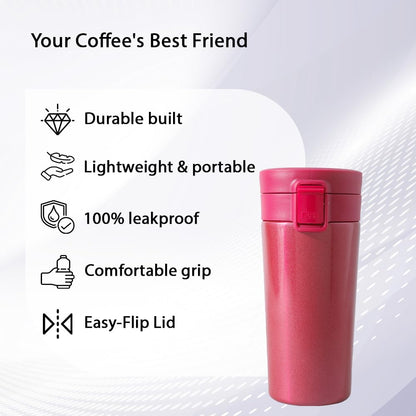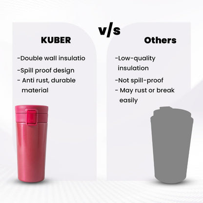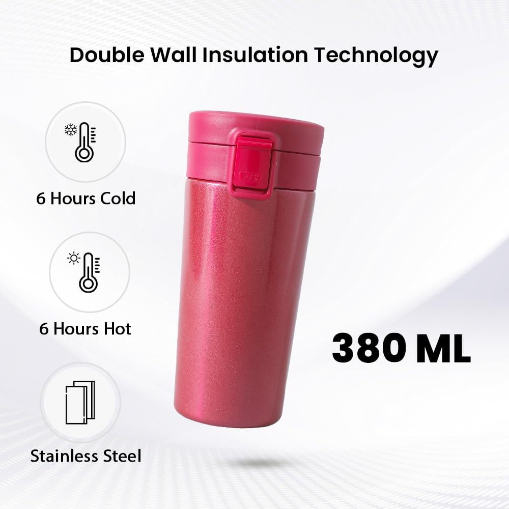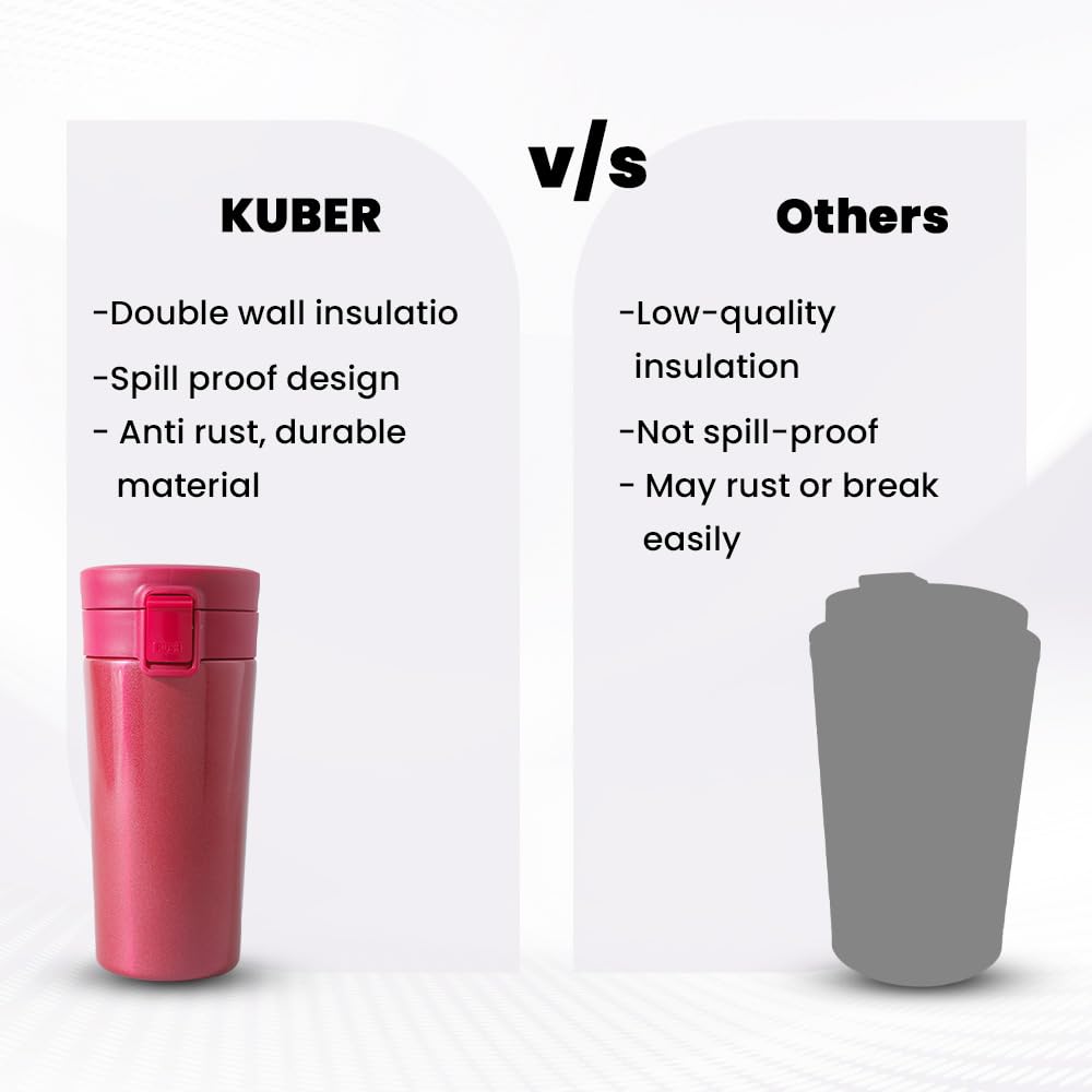 Kuber industries Stainless Steel Insulated Coffee Tumbler With Sipper Lid 380 ML (Red) PACKAGE CONTAINS: 1 Piece Insulated Coffee Mug|MATERIAL: Inner material: 304S/S, Outer material: 201S/S|PRODUCT DIMENSION: 17.3x7.7x7.7 Cm SUPERIOR INSULATION: The Kuber Industries Stainless Steel Vacuum Insulated Travel Mug utilizes advanced vacuum insulation technology to keep your beverages hot or cold for hours. It effectively maintains the desired temperature, allowing you to enjoy your favorite drinks at their best, whether it's a piping hot coffee or refreshing iced tea. PREMIUM STAINLESS STEEL CONSTRUCTION: Crafted with high-quality stainless steel, this travel mug offers exceptional durability, ensuring long-lasting performance. The sturdy and corrosion-resistant material not only provides strength but also adds a sleek and modern look to the mug. LEAK-PROOF AND SPILL-RESISTANT: The travel mug features a secure and reliable leak-proof design, allowing you to carry it in your bag or backpack without worrying about spills or leaks. The tightly sealed lid with a silicone gasket ensures a tight fit, providing peace of mind during your travels. VERSATILE AND PORTABLE: Whether you're commuting, traveling, or heading to the office, this travel mug is the perfect companion for your favorite hot or cold beverages. Its compact and portable design allows you to enjoy your drinks anywhere, anytime, ensuring you stay refreshed throughout the day.