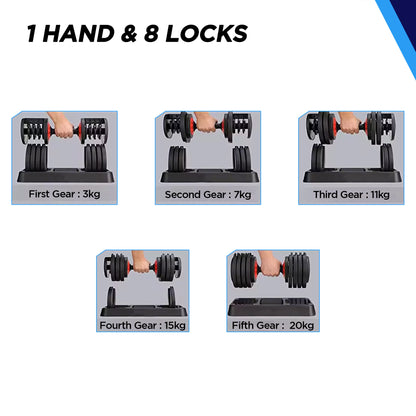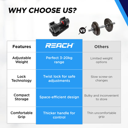 Introducing the HRX Ignite 20 kg Adjustable Dumbbell Set by Reach, the ultimate solution for home fitness enthusiasts. This innovative dumbbell set is designed with a versatile twist lock technology that allows you to easily adjust weights from 1kg to 20kg, replacing an entire rack of traditional weights. Crafted from durable alloy steel and coated in a sleek black neoprene finish, this dumbbell set ensures long-lasting use while resisting oils and solvents.