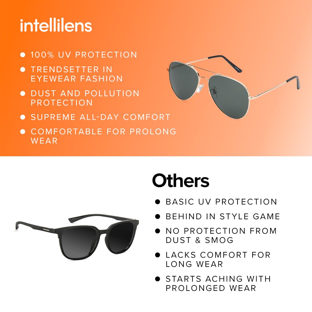 Introducing the Intellilens Aviator Sunglasses, your perfect companion for sunlit adventures. Designed for both men and women, these sunglasses boast a stylish aviator shape that not only exudes charm but also offers essential protection with 100% UV shielding. Crafted from durable yet lightweight polycarbonate material, these sunglasses ensure comfort during extended wear.