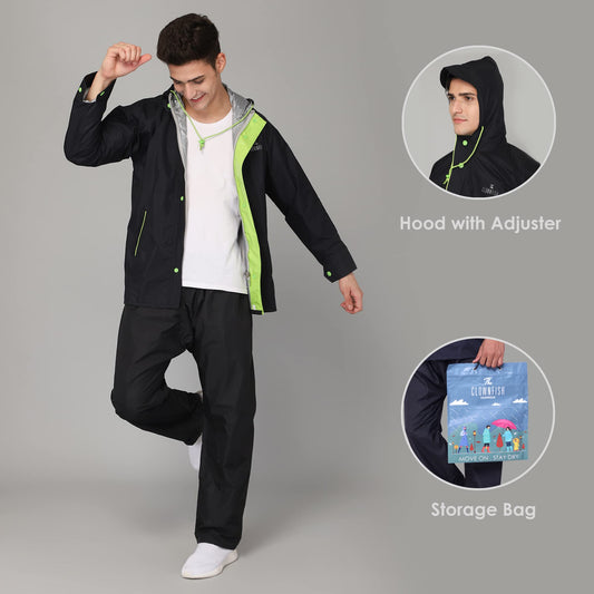 THE CLOWNFISH Arthur Series Men's Waterproof Polyester Double Coating Reversible Raincoat with Hood and Reflector Logo at Back. Set of Top and Bottom. Printed Plastic Pouch with Rope (Black, X-Large)