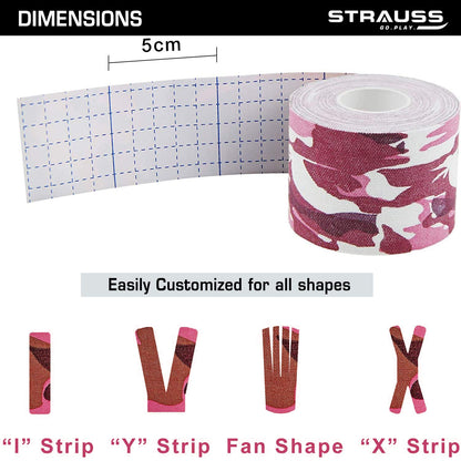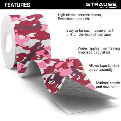 STRAUSS Kinesiology Sports Tape for Knee,Calf & Thigh Support|Waterproof Athletic Sports Tape for Muscle Support,Hand Leg Joint Support & Physiotherapy|Kinesio Tape for Sports Injury,(Camo Pink)