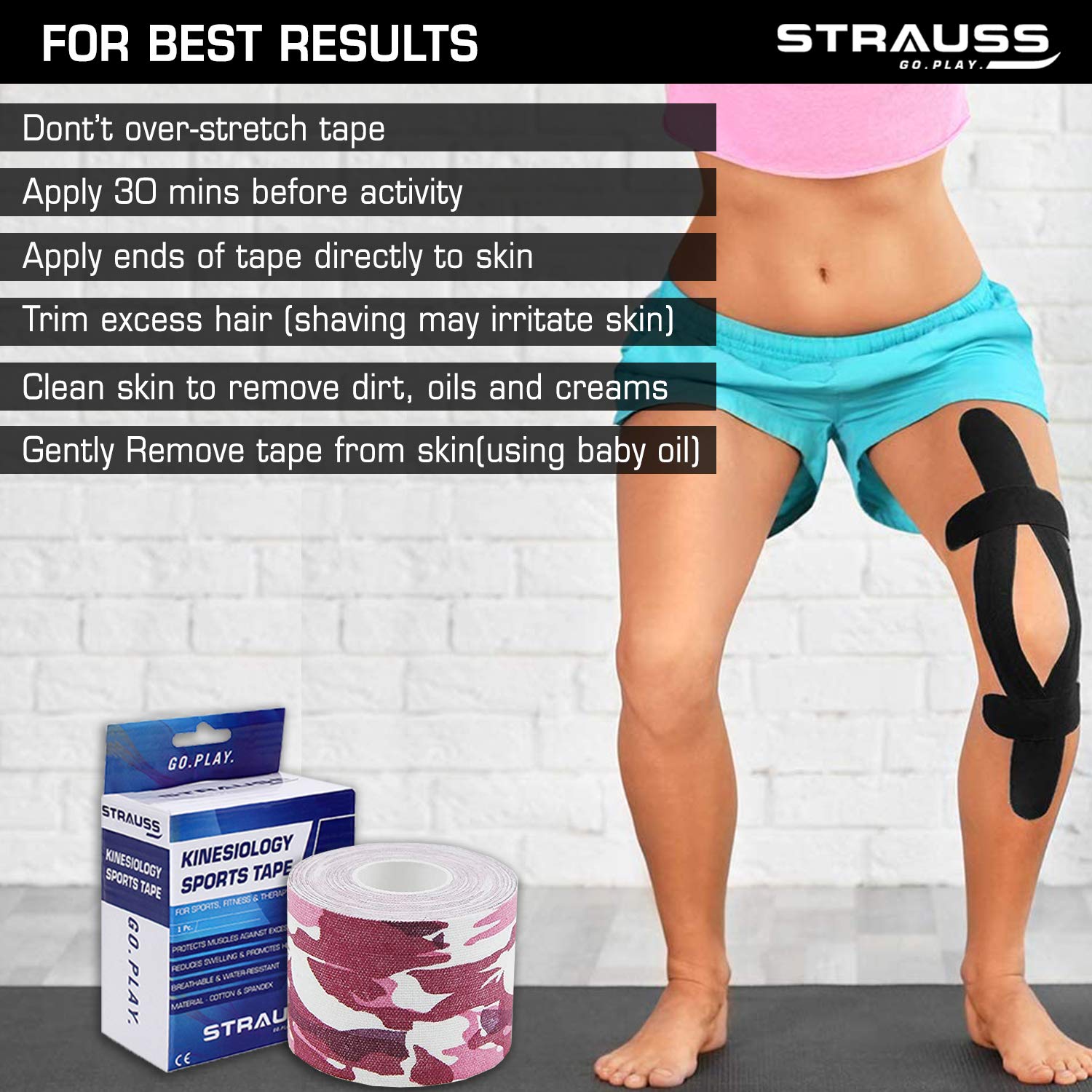 Introducing the Kinesiology Sports Tape for Knee, Calf & Thigh Support by Strauss Sports. This 5m roll of Camo Pink tape is designed to alleviate and support knee pain resulting from injuries or diseases like arthritis. Crafted from high-quality cotton, this kinesiology tape not only provides superior performance but also adds a touch of style with its unique camouflage print.