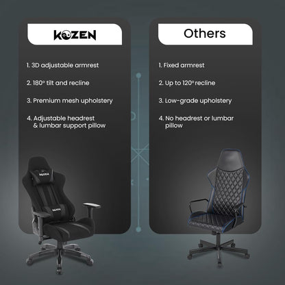 KOZEN Diablo Gaming Chair - Ergonomic, 180° Recline | Adjustable Neck Pillow & Lumbar Support | Blue (Black)