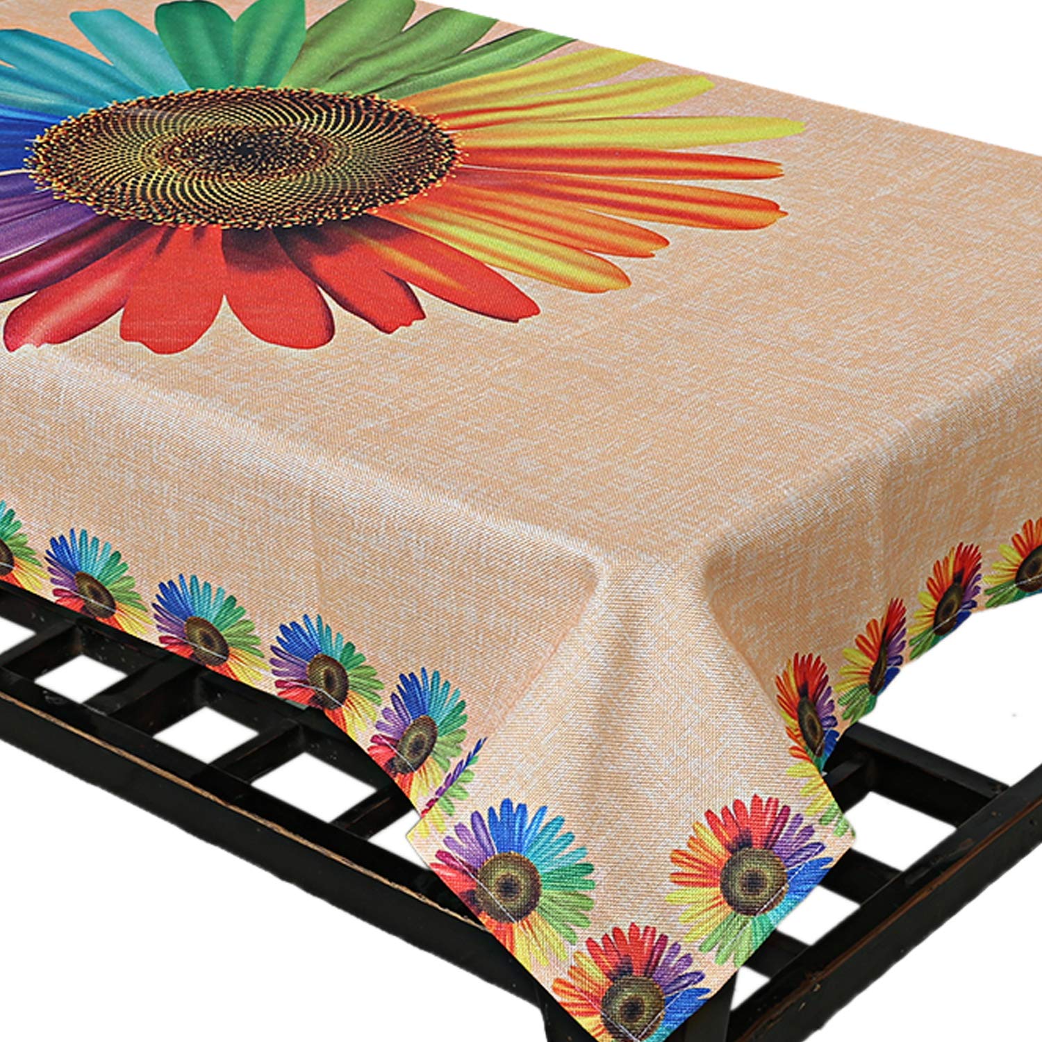 Introducing the Center Table Cover by Kuber Industries. This exquisite 4 Seater table cover is crafted from high-quality jute material, ensuring superior durability and strength. Its elegant gold color and striking Sun Flower Design will add a touch of sophistication to any setting, making it perfect for both indoor and outdoor events. Designed to fit standard-sized tables, this table cover measures 150 x 100 x 1 CM, ensuring full coverage and a stylish appearance.