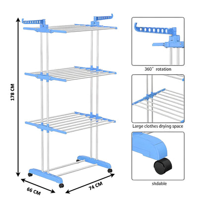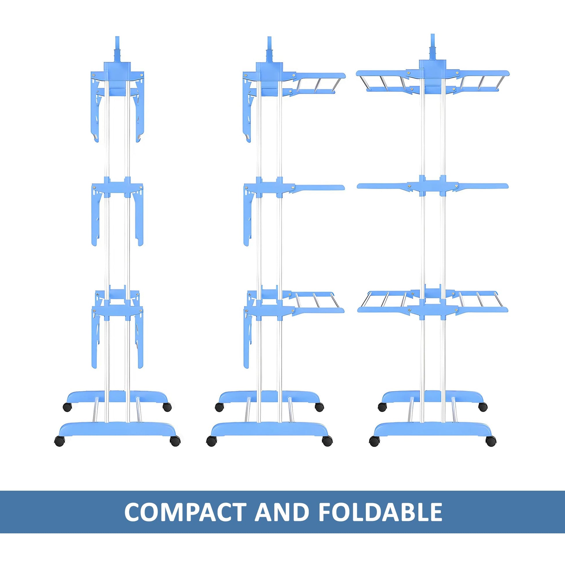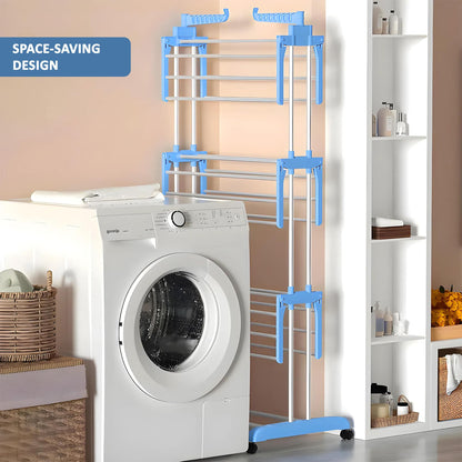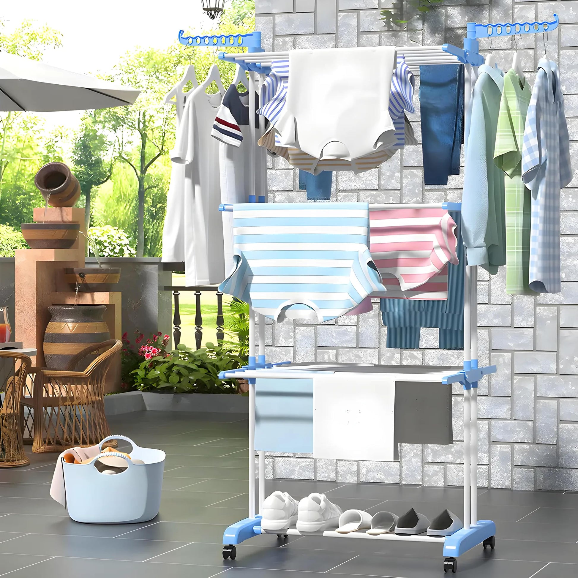 Clothes Drying Stand with Wheels | Foldable Steel Clothes Stand for Drying | 4-Layer Balcony Dry Racks | Laundry Rack for Room Corner | Blue